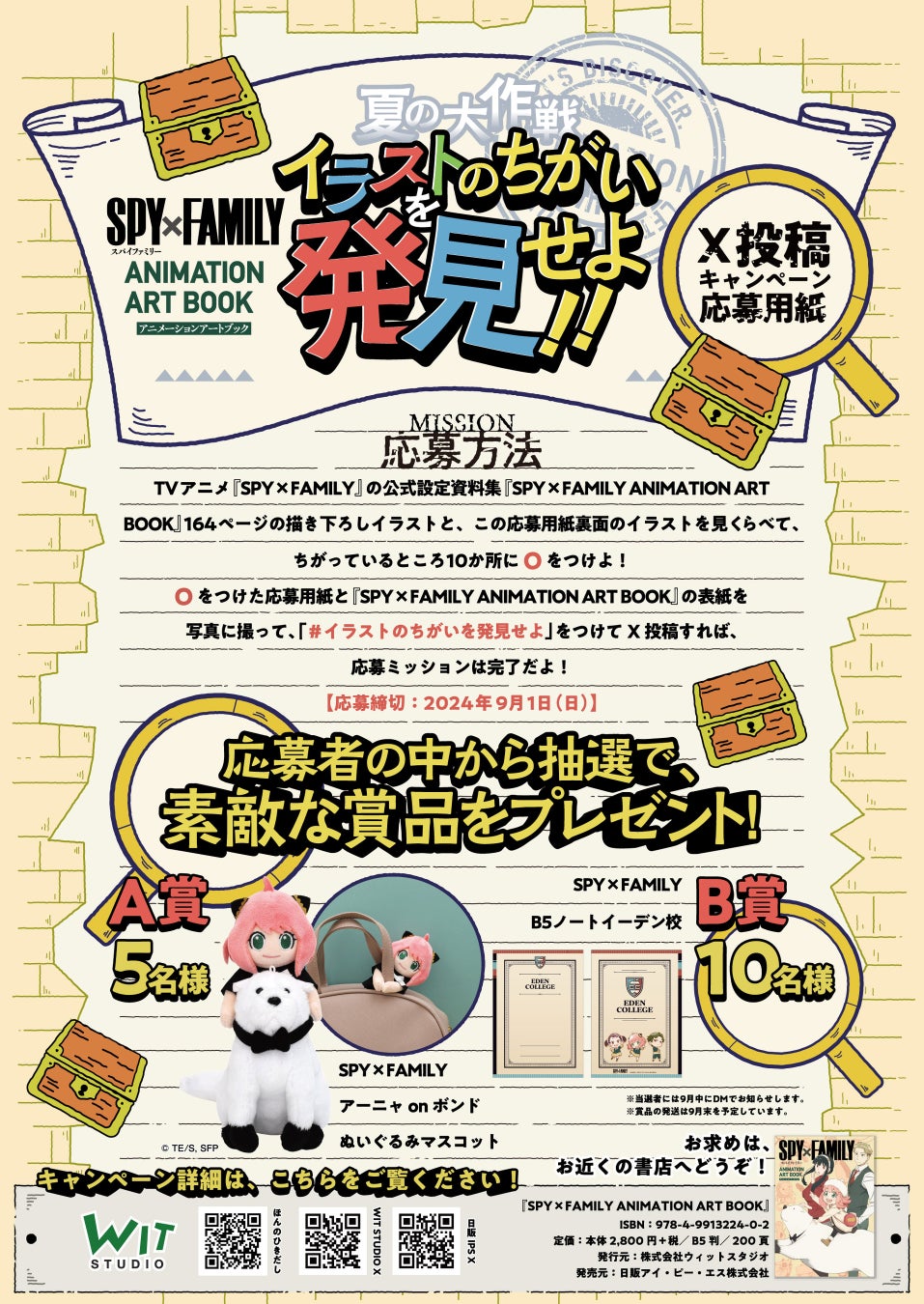 株式会社ウィットスタジオ(本社:東京都武蔵野市、代表取締役社長:和田丈嗣 )と日販アイ・ピー・エス株式会社(本社:東京都文京区、代表取締役社長:佐藤 弘志)は、発行するTVアニメ『SPY×FAMILY』の公式設定資料集『SPY×FAMILY ANIMATION ART BOOK』のX投稿キャンペーン「SPY×FAMILY ANIMATION ART BOOK 夏の大作戦 イラストのちがいを発見せよ!!」を2024年7月26日(金)より、全国133書店にて開催します。