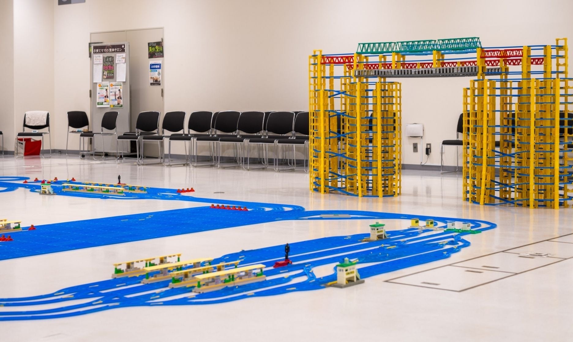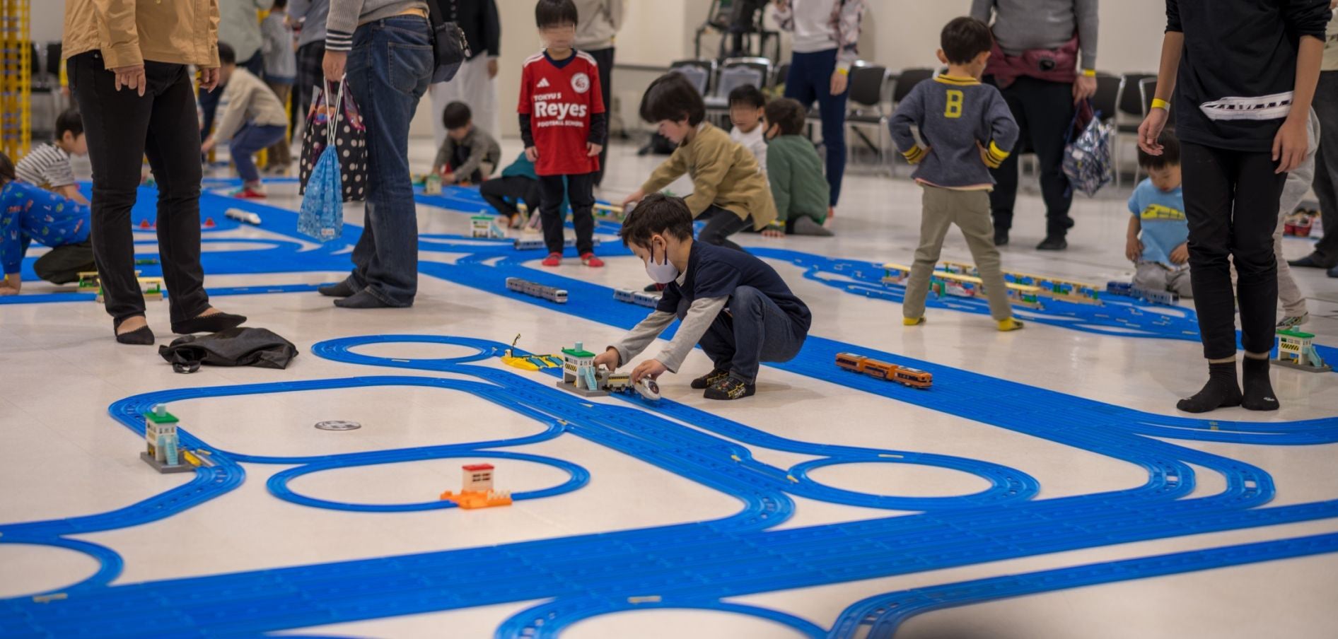 プロのプラレーラーYouTuberで、メディアへの出演実績も多数ある松岡純正さんが、約200平方メートルのホールに創り上げる巨大なレールの上で、子どもが自分の電車のおもちゃを自由に走らせることができます。