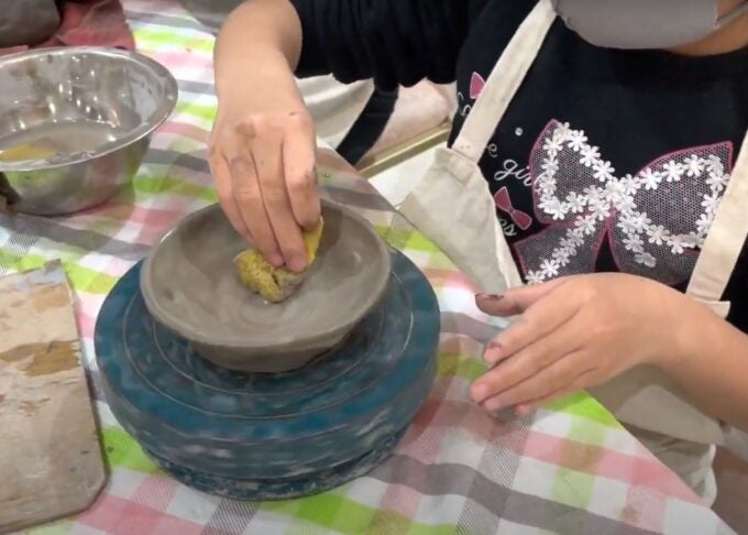 手回しロクロを使って、親子一緒に陶芸作品を作ります。