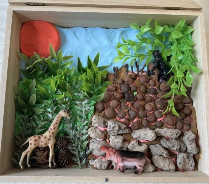 恐竜や動物のフィギュア、自然の素材を使って、自分だけのオリジナルな箱庭を作ります。