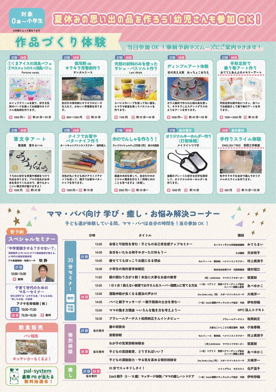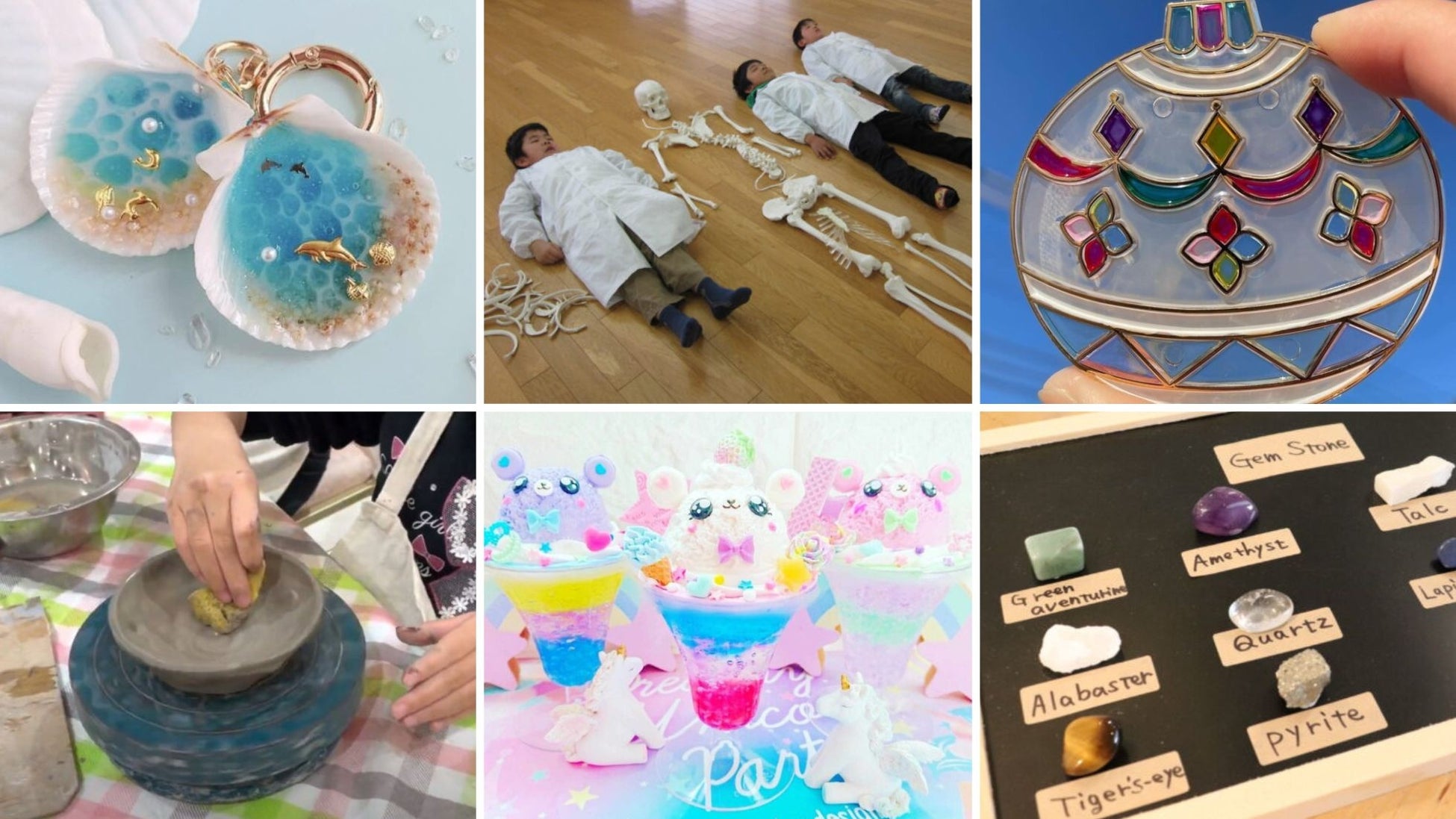 読書感想文教室、オシゴト体験、ガイコツの研究、天然石標本、レジン教室など、夏休みの自由研究・工作に役立つ独自コンテンツが50以上集合!子育て中のママ・パパを応援するセミナーも。