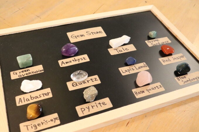 講師の先生が自然の中から集めてきた天然石を使って標本を作ります。