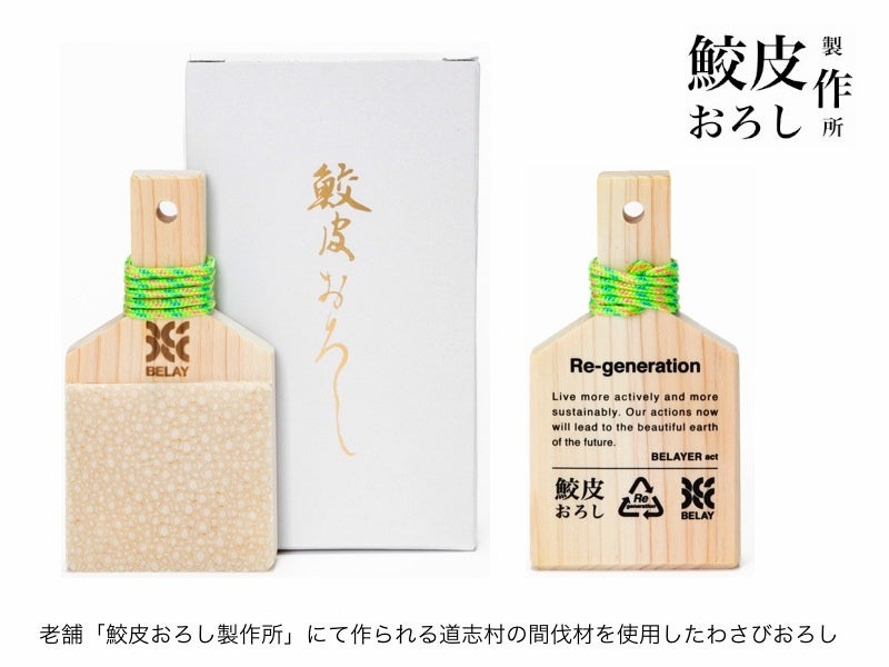 ◯鮫皮わさびおろし 【数量限定商品】/ 岐阜の老舗工房「鮫皮おろし製作所」製作のBELAYオリジナルのわさびおろしです。希少な本鮫皮と道志村の間伐材(檜)を使用し、持ち運びに便利な小型サイズ。個人使用やキャンプなど野外でも本わさびの美味しさをご堪能いただけます。