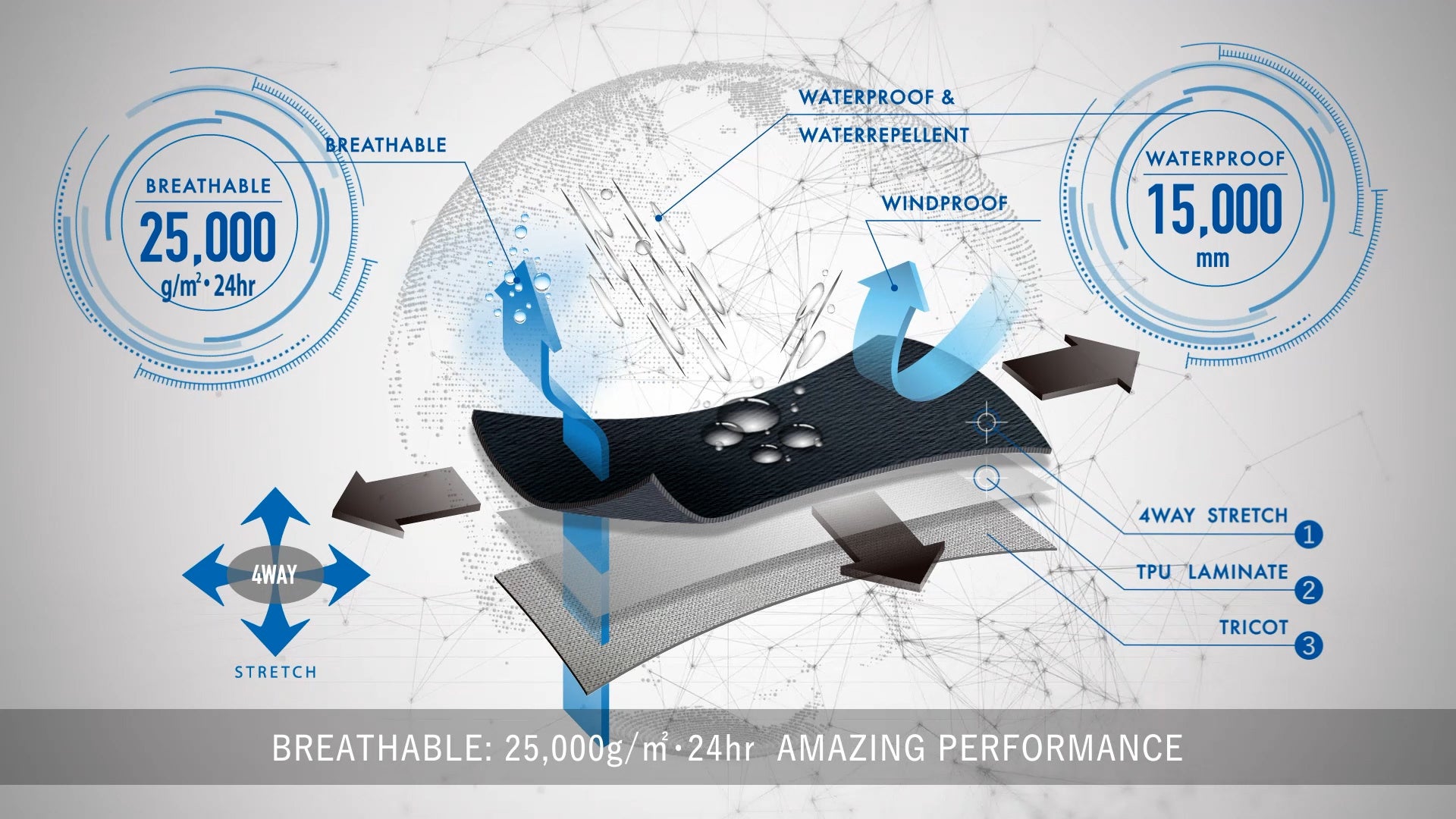 ※透湿度は24時間で水蒸気を外に排出する量を表記したものになります。透湿度25,000g/m2/24hrは24時間で25リットルの水蒸気を排出する機能となります。