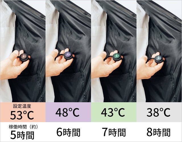 暖かさはボタンによって4段階に調節が可能。安全機能搭載(3時間で自動的にOFFに切り替わります)なので、低温やけどの心配もありません。さらにバッテリーはお手持ちの市販のモバイルバッテリーで給電可能なUSB接続タイプ。