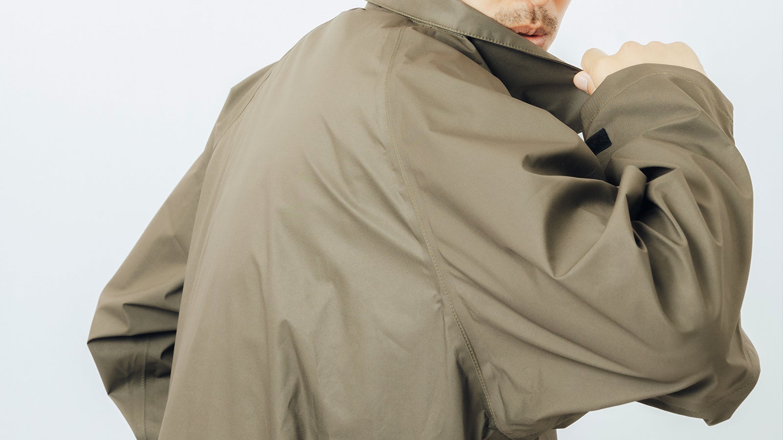このコートに採用されている生地「凄ラク3レイヤー」は、大雨にも耐えられる耐水圧15,000mm※を備えています。もちろん縫い目には水が染み込んでこないようにしっかりとシームシーリングされていますし、生地表面には撥水加工を施し、雨滴も弾いてくれるので、外側からの雨の侵入をシャットアウトしてくれます。