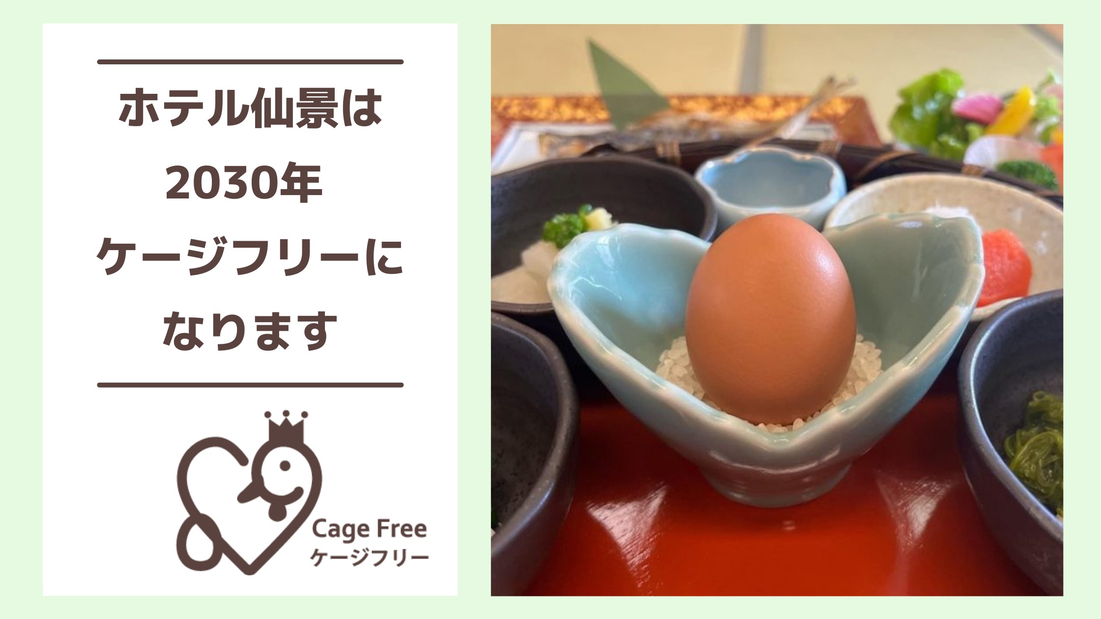 2022年3月18日、ホテル仙景(神奈川県箱根湯本:若おかみ 津田かおり)は、アニマルウェルフェアとSDGsの双方を重視し、当館で使用する卵を、2030年までに100%ケージフリー、つまり平飼い又は放牧の卵に切り替えることを発表いたします。