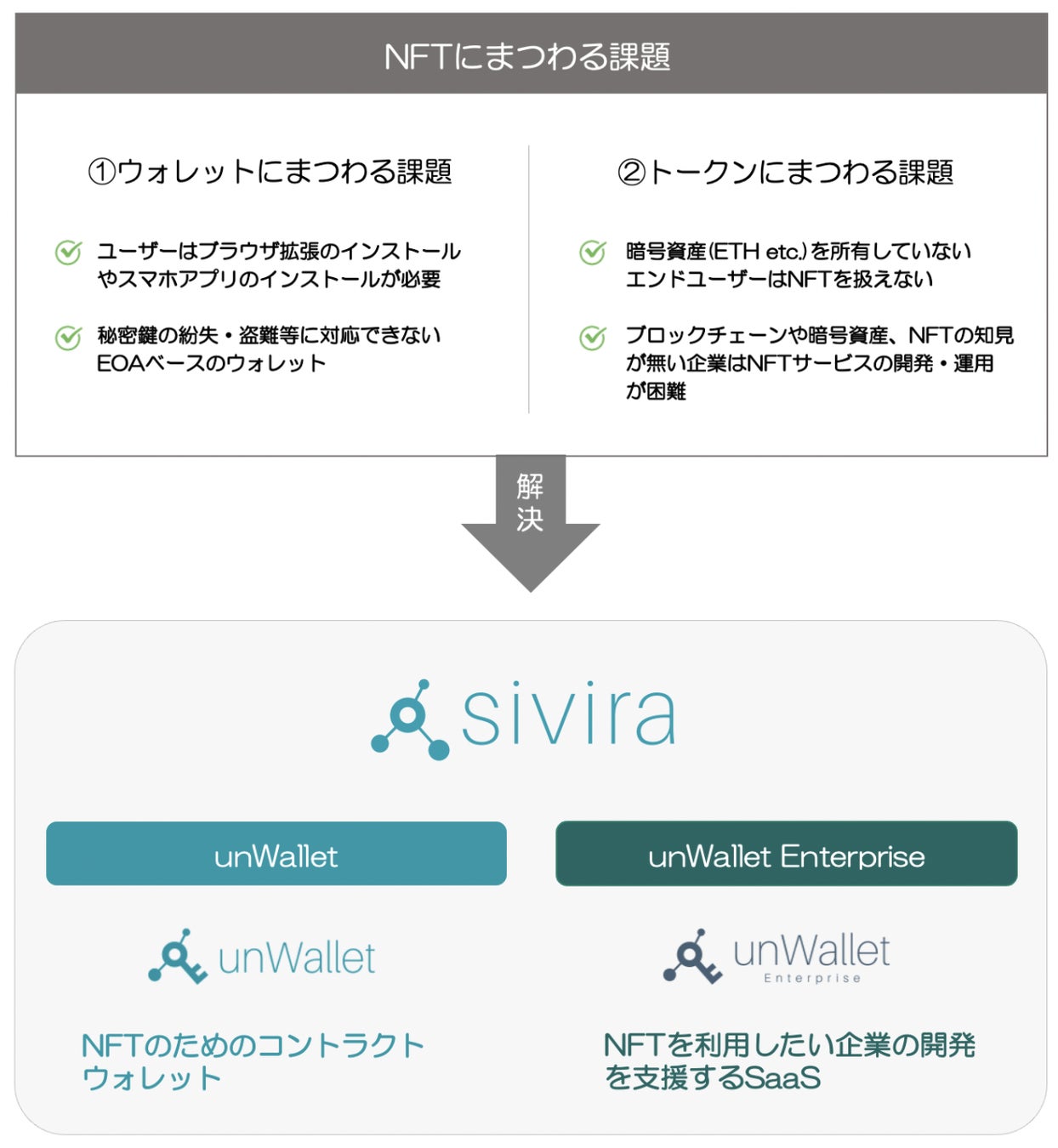 一方、NFTには課題も存在します。NFTにはパブリックチェーンのNFTとプライベートチェーンのNFTがあり、世界中で話題になっているのは前者ですが、現在パブリックチェーンのNFTにはユーザビリティに課題があるため、国内ではプライベートチェーンが選択されることが多くなっています。しかし、プライベートチェーンのNFTでは世界で起きている事で起きない事が多数存在します。シビラが提供するプロダクトはパブリックチェーンにおけるNFTの課題を解決し、日本のNFTをグローバルスタンダードへと導きます。