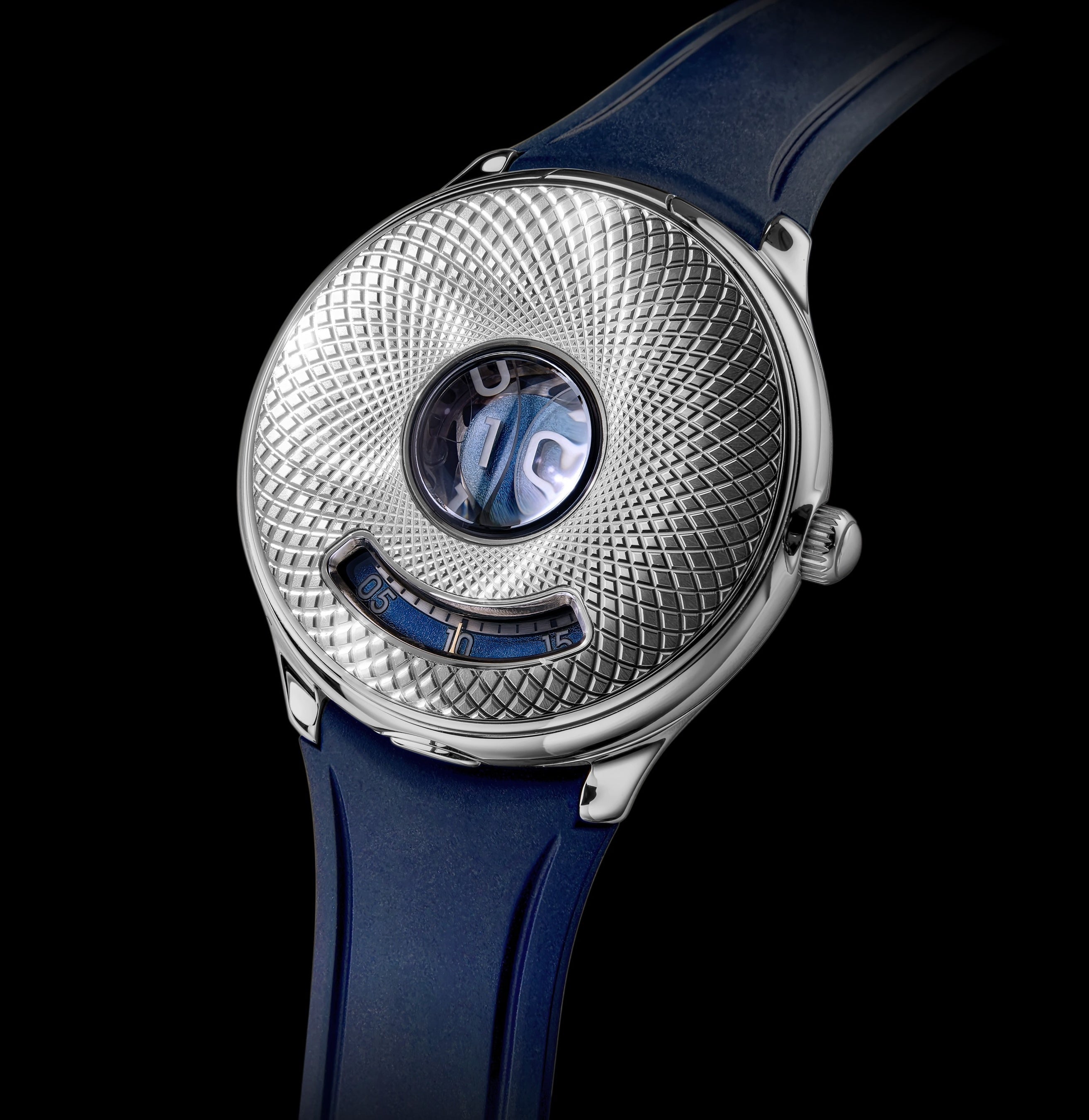24時間ジャンピングアワーと外周ディスクによる独創的な時の表示。裏面にはキャリバー10.1の精緻な仕上げが輝く。