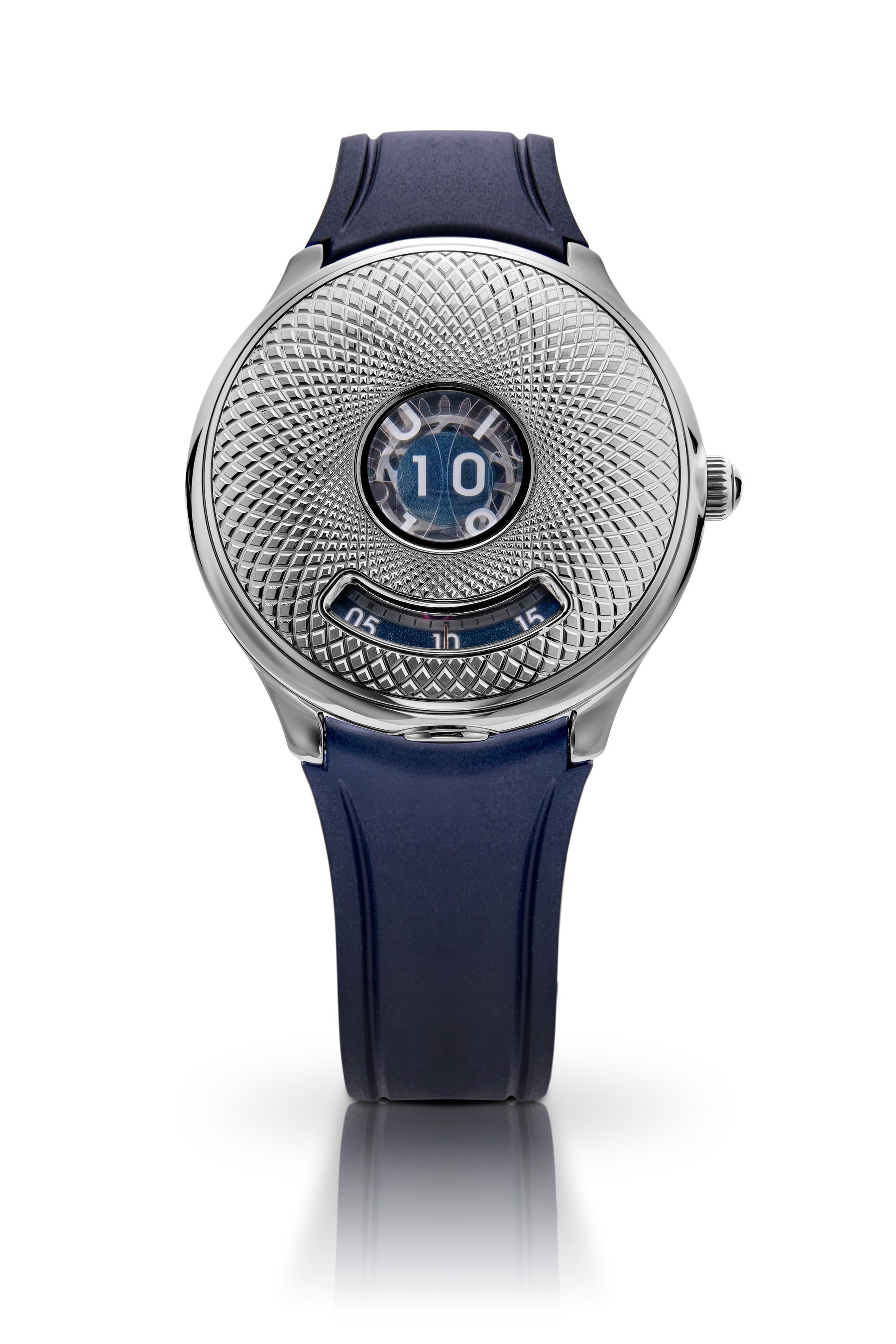 TIME JUMPERは、時の読み取り方を一新するジャンピングアワー・ウォッチです。10の位と1の位を2枚のサファイア・ディスクで表示する24時間制アワー表示に、外周リングの分ディスクを組み合わせました。