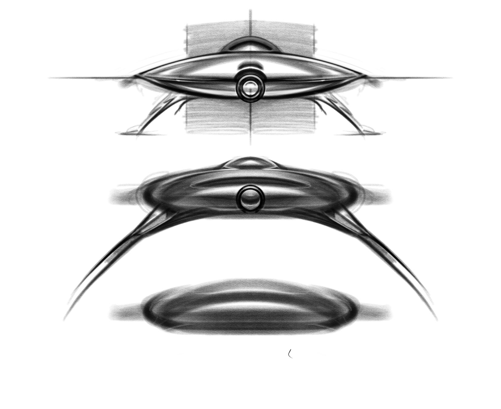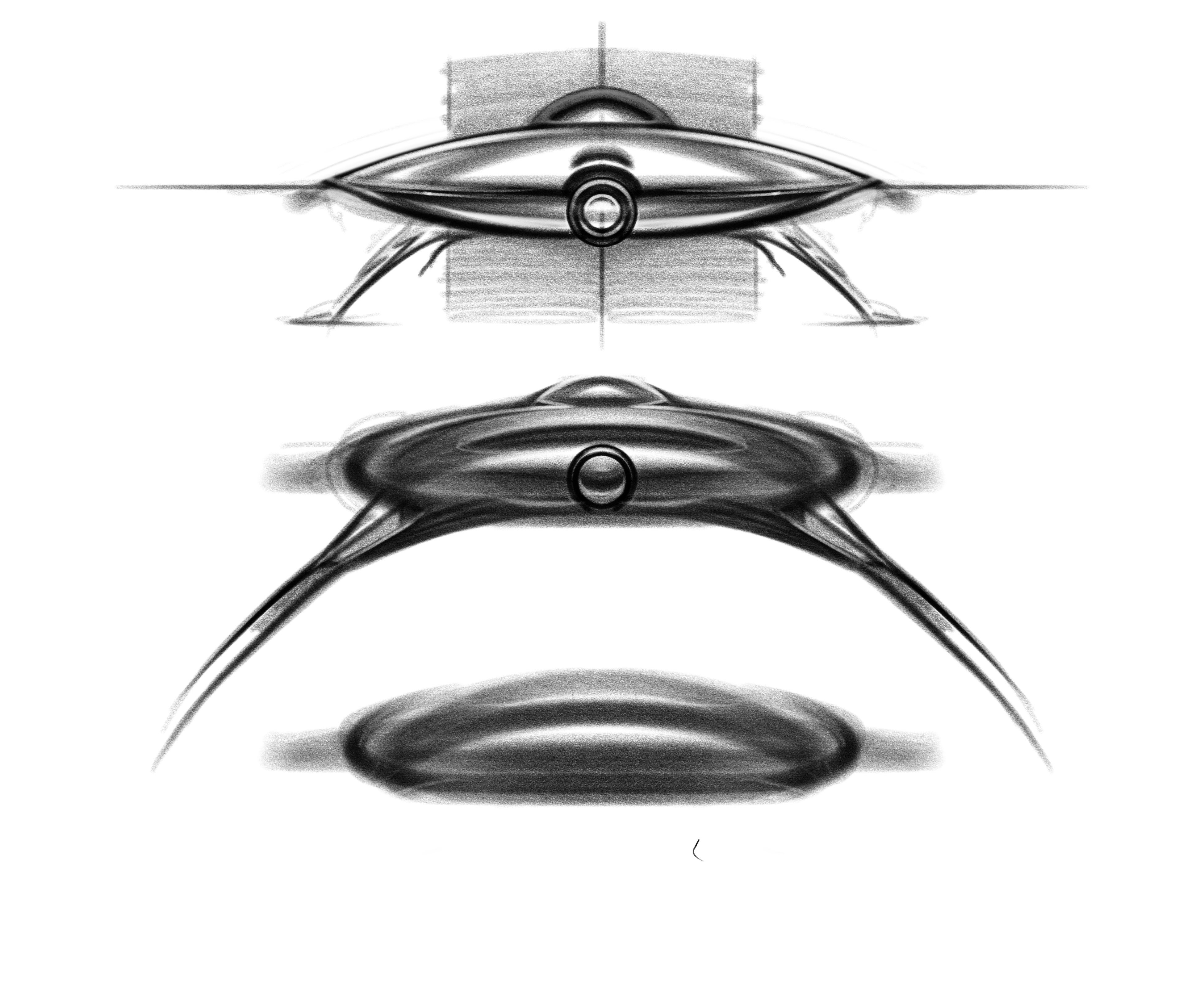 “空飛ぶ円盤”を思わせる有機的なフォルムが、ケース全体を流れるように包む。