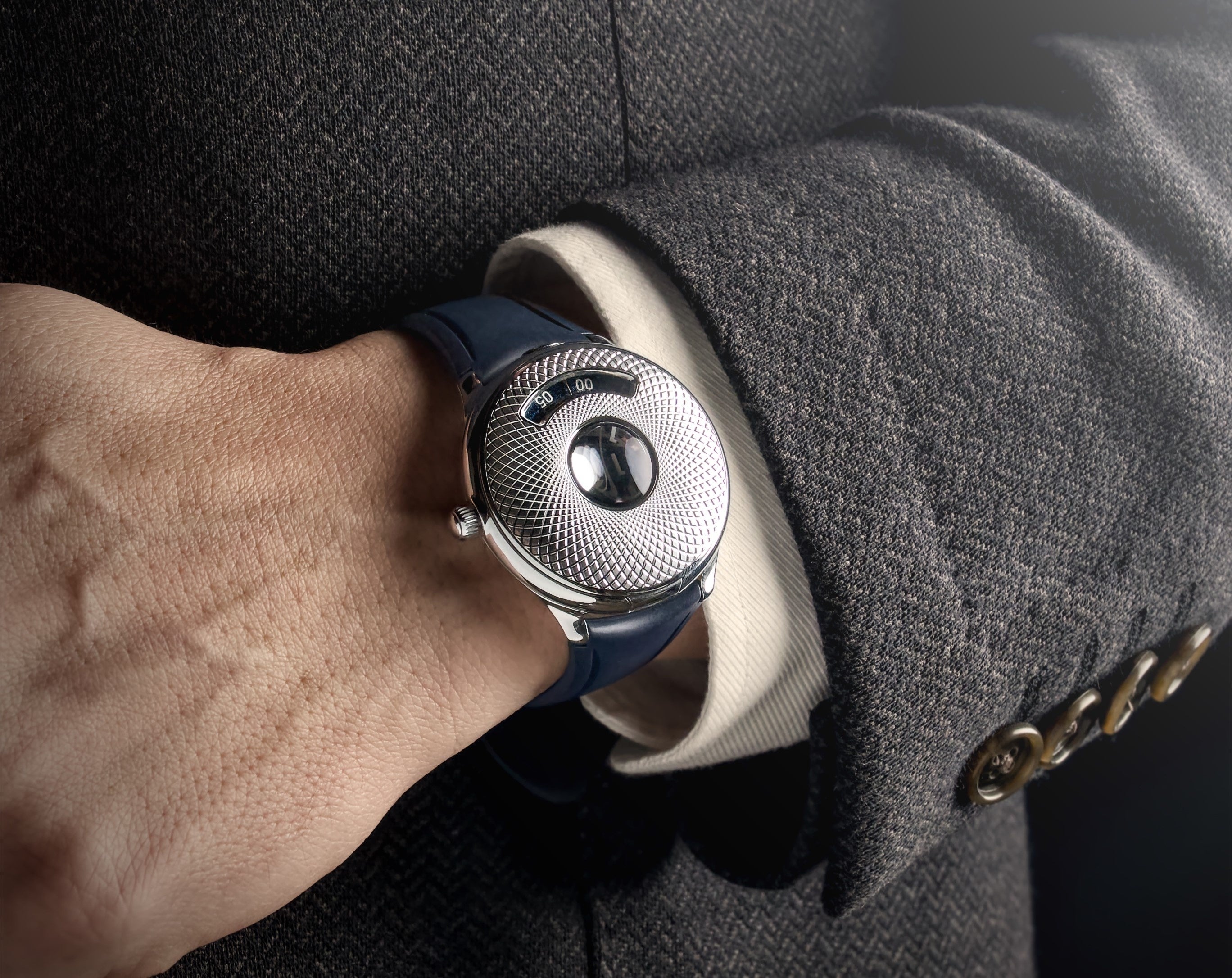 ケースデザインは“空飛ぶ円盤”を思わせる有機的フォルム。CzapekのデザインパートナーであるABコンセプトが手掛け、ラグやリューズに至るまで柔らかな曲線で統一されています。カバーのギョーシェ彫りはMetalem社によるCzapek専用の新パターンで、深い中心に向かって光を吸い込むような視覚効果を生み出します。