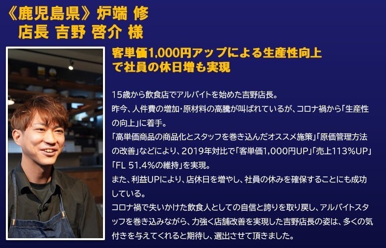 目的「居酒屋から日本を、世界を元気にする」という想いを持つ全国の同志により開催された、外食業界に働く人がより誇りを持ち、学びを共有できる場を提供する大会です。