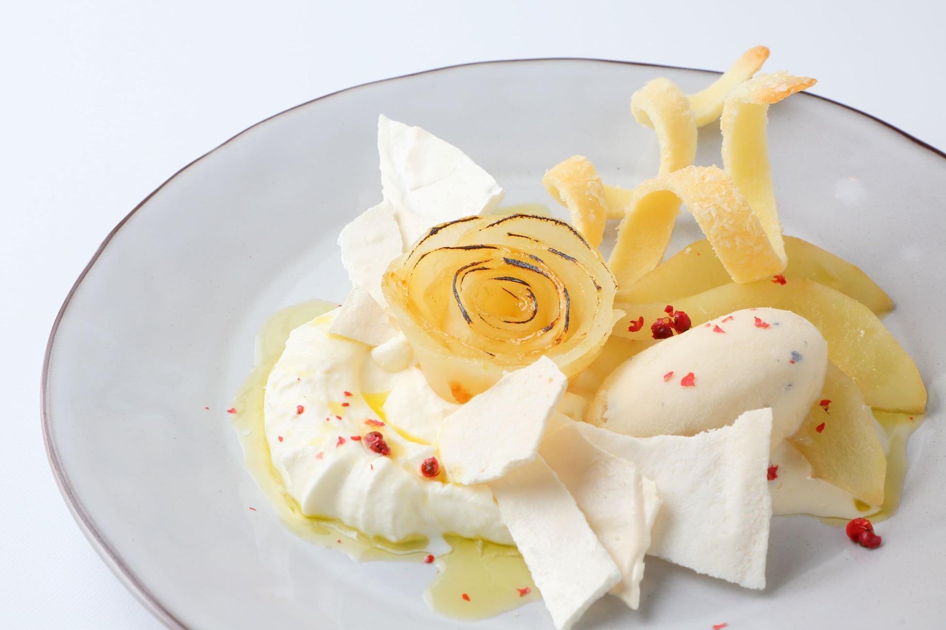 北海道余市町産の洋梨「バートレット」をキャラメリゼしたロンバルディア風デザート。ゴルゴンゾーラのジェラートとマスカルポーネクリームがチーズの芳醇な味わいを引き出します。果肉がやわらかく、バターのような舌触りの「バートレット」を可憐なバラの花のように盛り付けました。メレンゲとラングドシャのサクサクした食感と一緒にお召し上がりください。
