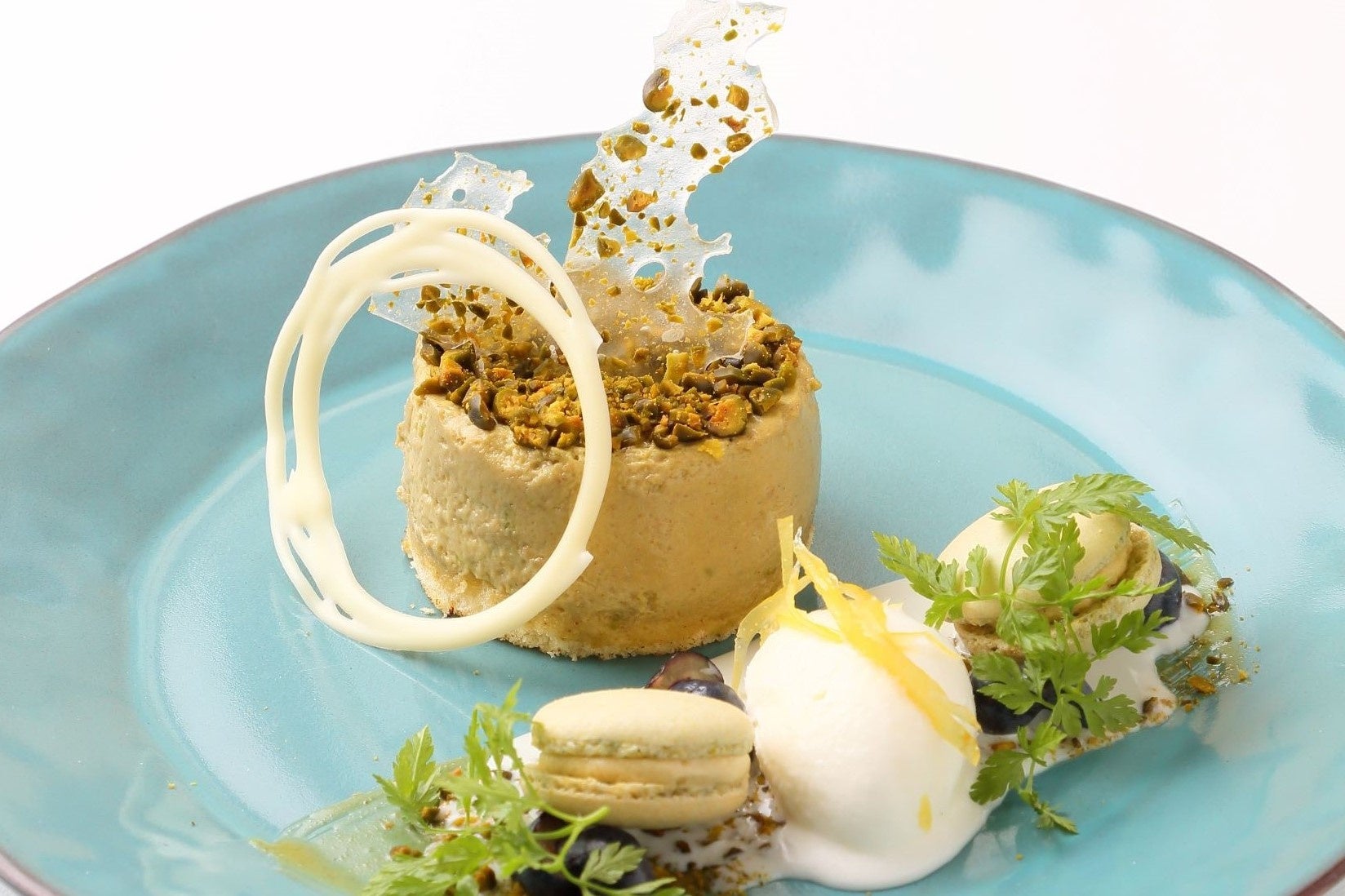 シチリア産ピスタチオにライムの香りが爽やかな濃厚デザート。キュートなピスタチオのマカロンに、ブルーベリーの酸味が味わいを整えます。甘味を調節した自家製バニラジェラート、ホワイトチョコレートのリングのアクセントです。- さわやかな喉ごしのモクテル3種も同時発売
