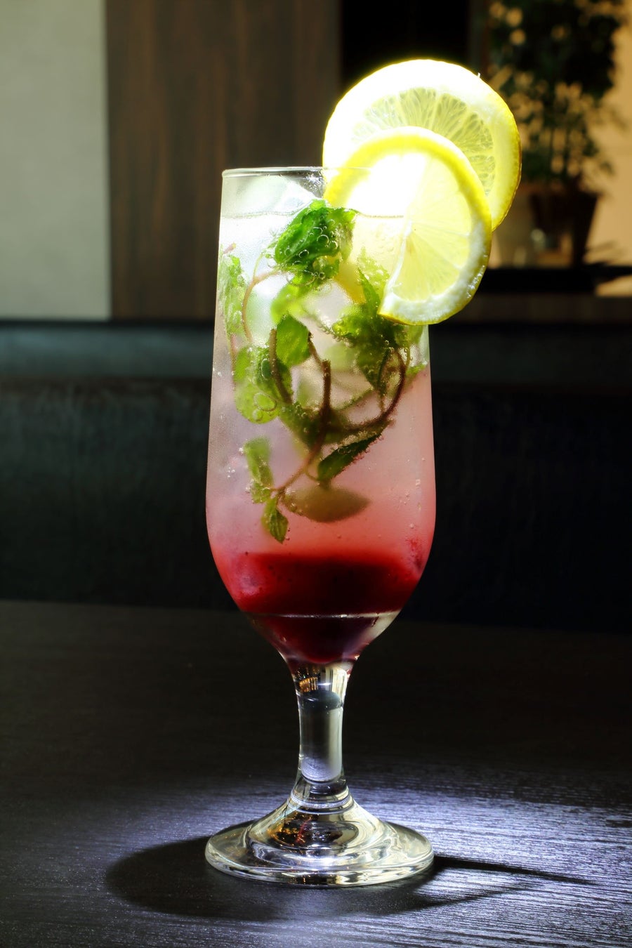 ミックスベリーのヴァージンモヒート。フランボワーズとブルーベリーをベースに、レモンの香りを感じていただけます。