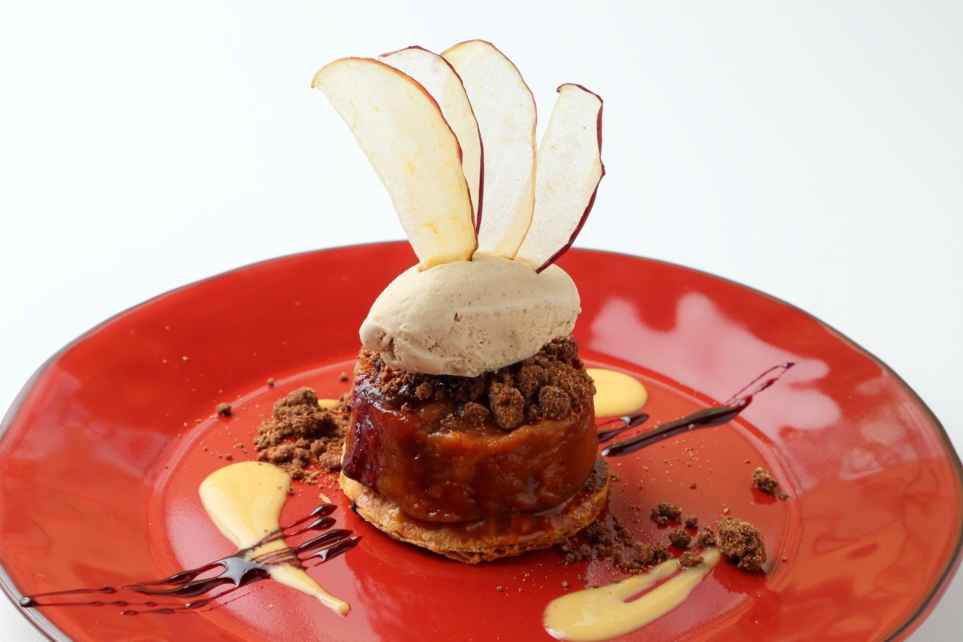 北海道余市町産のりんご「恋空」を贅沢に使用したヴェネツィア風タルトタタン。アールグレイのアイス、赤ワインソースとアングレーズソースで豊かな甘味を感じていただけます。シナモンとココアが効いたクランブルが、複雑な香りを演出。甘味と酸味のバランスがとれた果汁たっぷりの「恋空」の味わいを生かした繊細なスイーツに仕上げました。