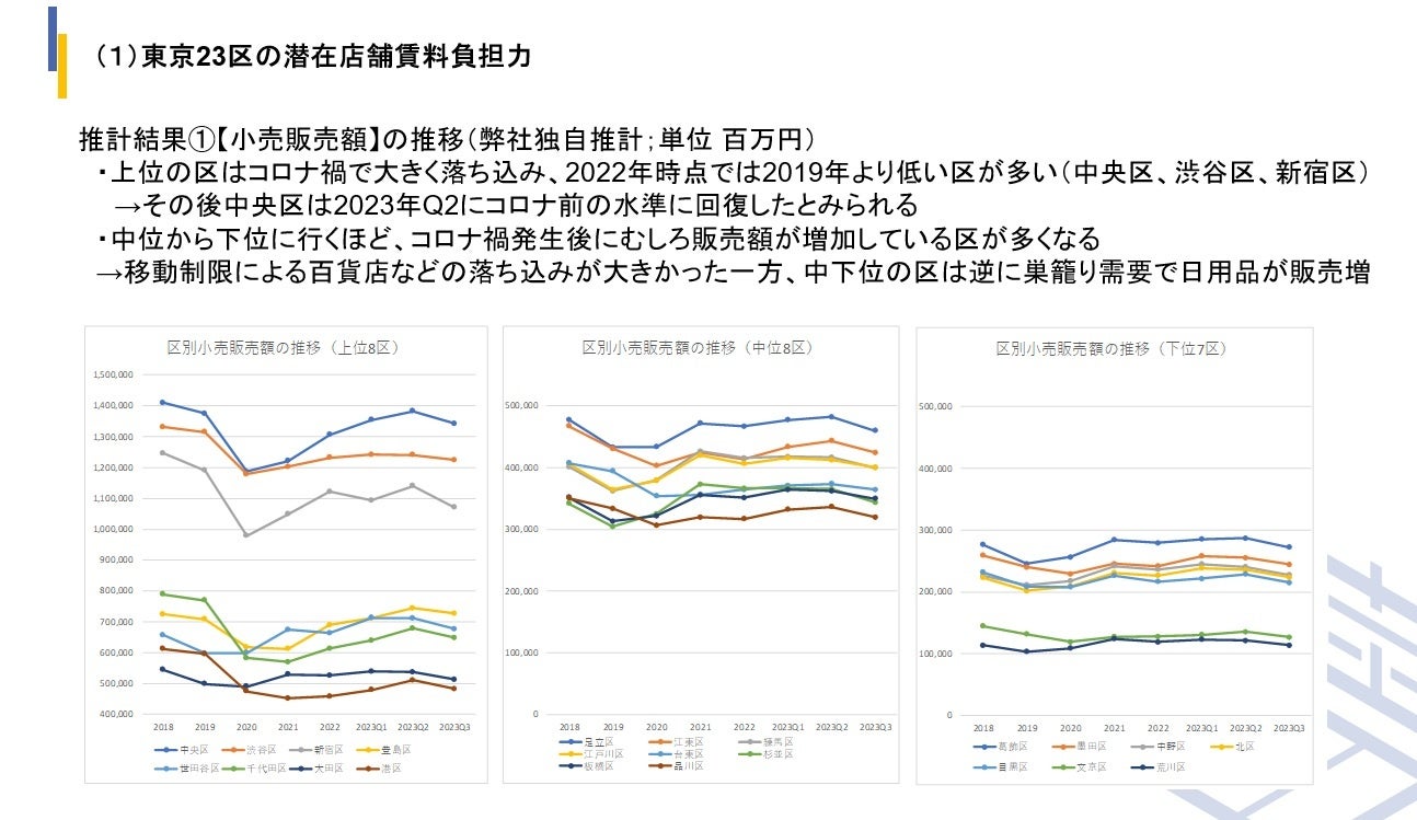 その結果、百貨店の躍進で2022年に大きく回復した中央区や新宿区、コロナ禍による巣籠り需要の発生でむしろコロナ禍前より収益性が上昇している杉並区や世田谷区など、区の特性によって販売額の水準や変化の軌跡が大きく異なっている状況が把握できました。