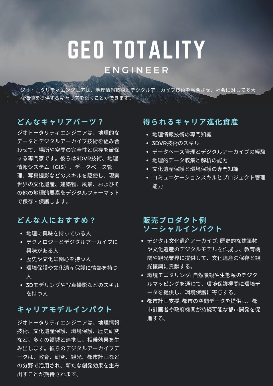 多彩なビジネス領域で課題解決を支援する株式会社ディレック(東京都品川区、代表取締役:宮本幸一)は、歴史的建造物や特殊な空間の3Dアーカイブ・コンテンツ制作で多くの実績をもつ株式会社exAgent(代表取締役社長:中山智博)と提携し、同社監修のもとで建造物や空間を高精度・高品質にデジタル化し、リアルな3Dモデル(デジタルツイン)データとして簡単に活用できるサービス「可視価・CaSeeCa」を展開しています。さらに、「可視価・CaSeeCa」によって新しい市場が生まれ、新たに生まれてくる職業(キャリアパーツ)として、「ジオトータリティエンジニア」を創出。この革新的なエンジニアリングポジションは、現代のテクノロジーと地理情報システム(GIS)を統合し、地球環境と人間社会の複雑な相互作用を理解しながら、解決するために設計されたキャリアパーツです。