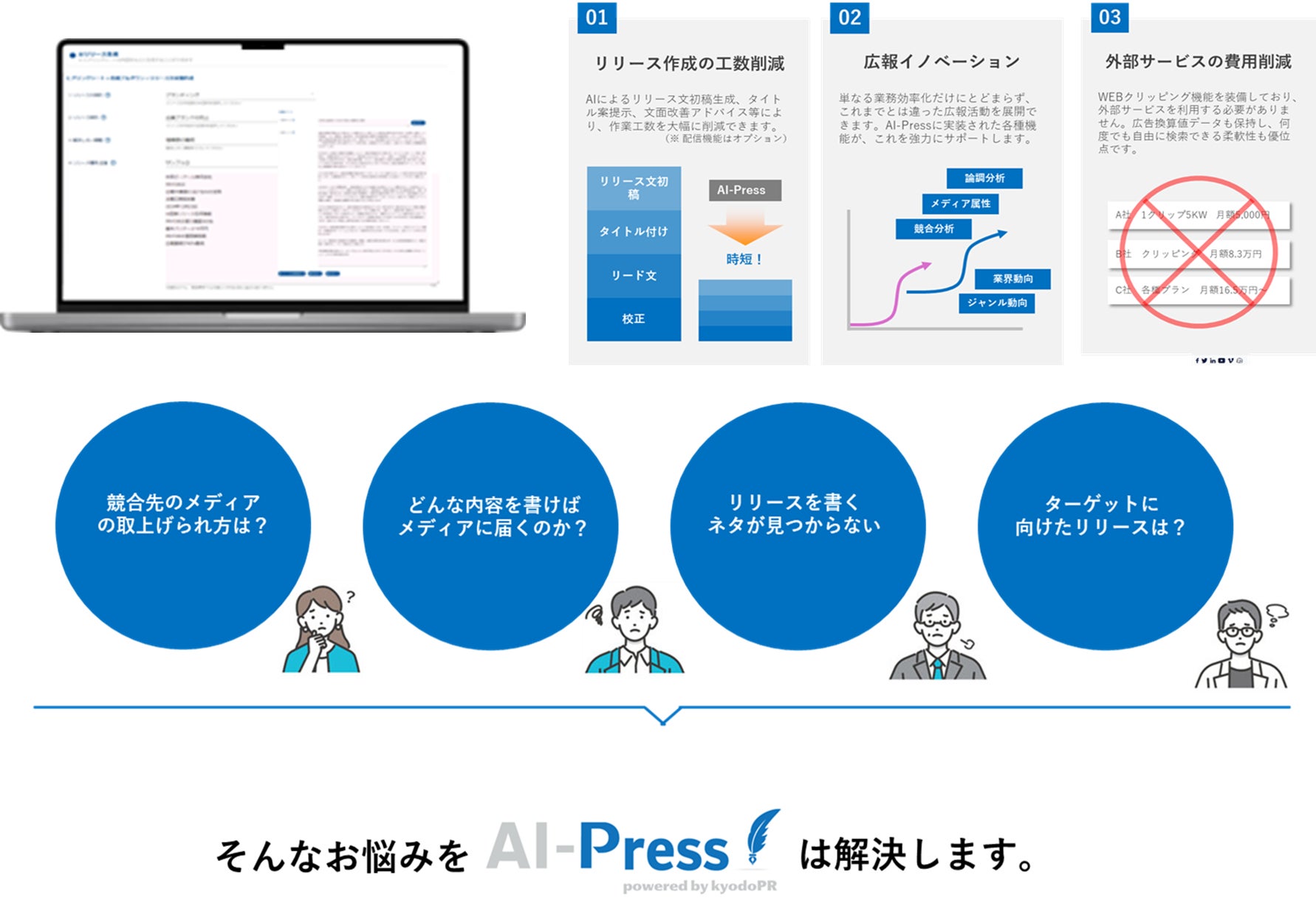 『AI-Press』は、広報業務に特化したAIリリース作成サービスです。リリースの初稿作成の他、AIを活用した業界論調分析といった情報収集の効率化機能をプラスし企業の情報発信力を大幅に向上させます。