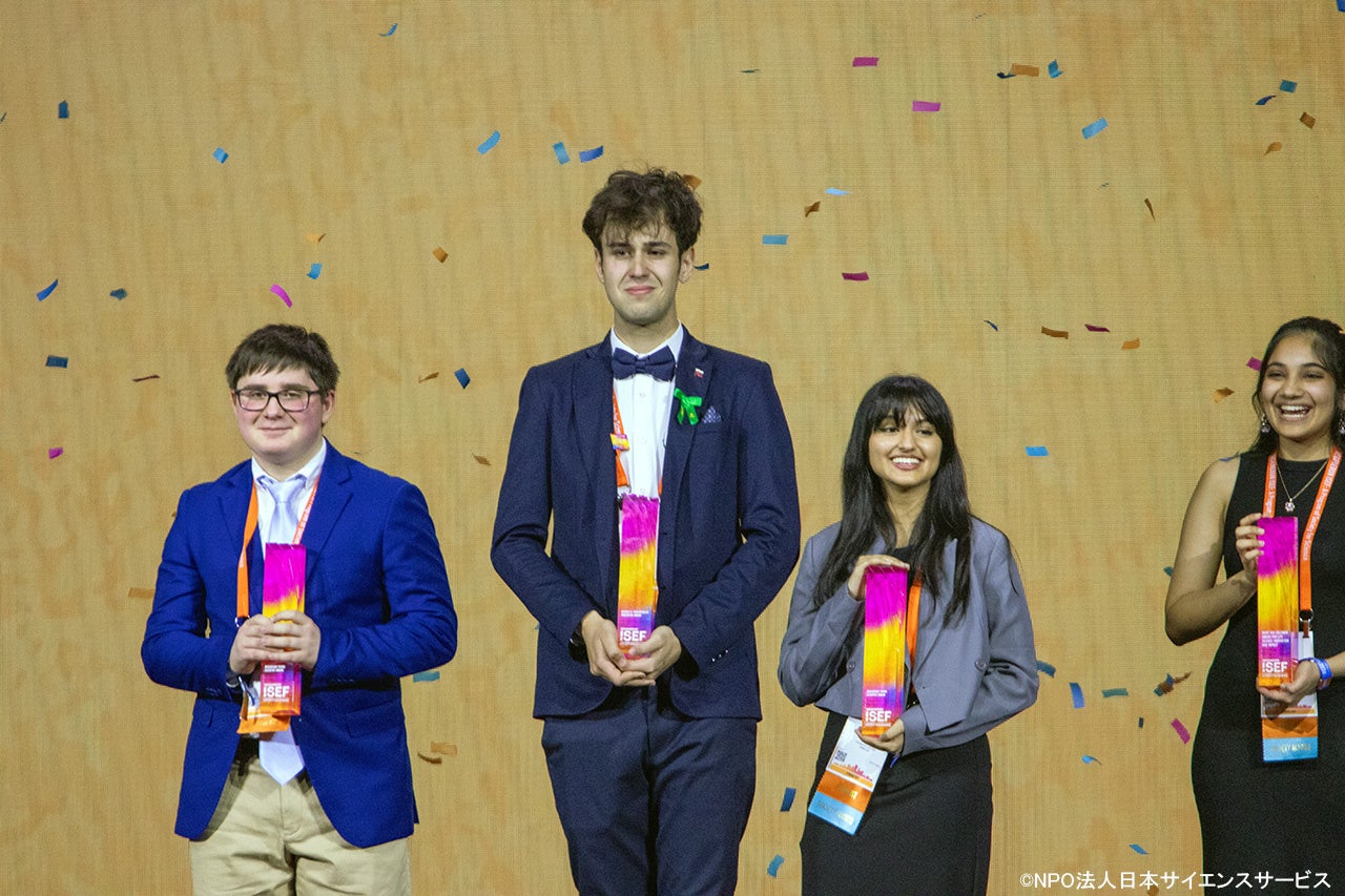 今年の日本代表からは、横浜市立南高等学校の西田優美奈さんと、筑波大学附属駒場高等学校の田中喜大さんによる2研究が部門優秀賞を受賞しました(所属はいずれも昨年度)。また、22の各部門での1等受賞者の中のうち、全体トップの賞となるジョージ・ヤンコポーロス賞にはスロバキアから出場したAdam Kovalcikさんが選ばれ、賞金100,000ドル(約1500万円)が贈られました。