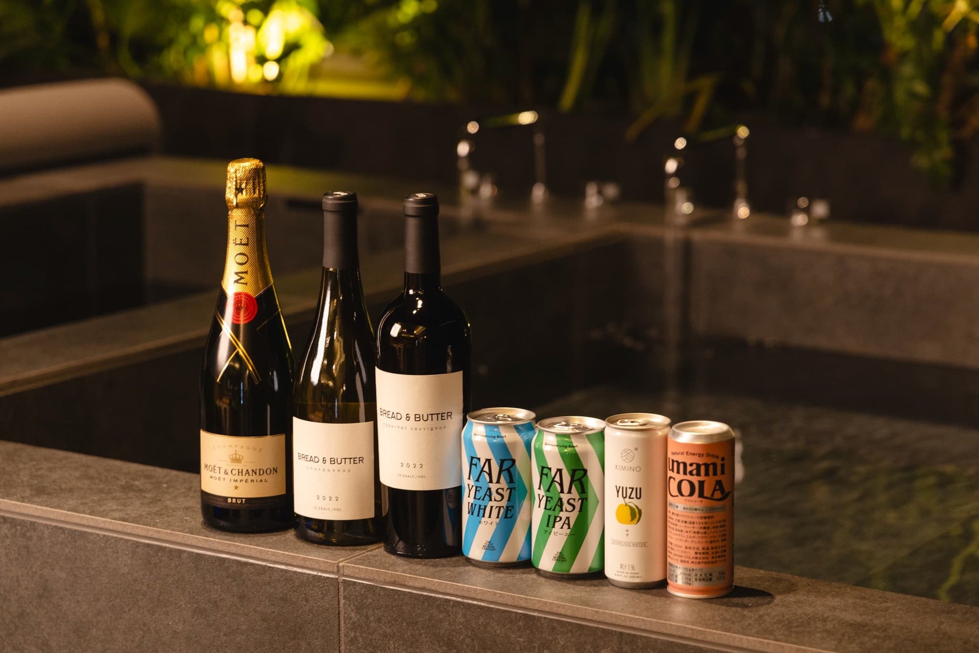 半露天風呂には、リラックスをテーマにブレンドした薬草風呂を採用。薬草の香りと温もりに包まれながら心身の疲れを癒やし、ゆったりとした憩いの時間をお楽しみいただけます。また客室の約3分の1を占める広々とした浴室には、デイベッドソファやチェア、スツールなどを設置し、お風呂に「浸かる」だけでないさまざまな過ごし方を可能としました。東京の美しい夜景を一望できる大きな窓からは、日常の喧騒から解放されたぜいたくなひとときが広がります。さらに、天然植物を飾った空間は、視覚的にも心身を癒やす効果をもたらします。
