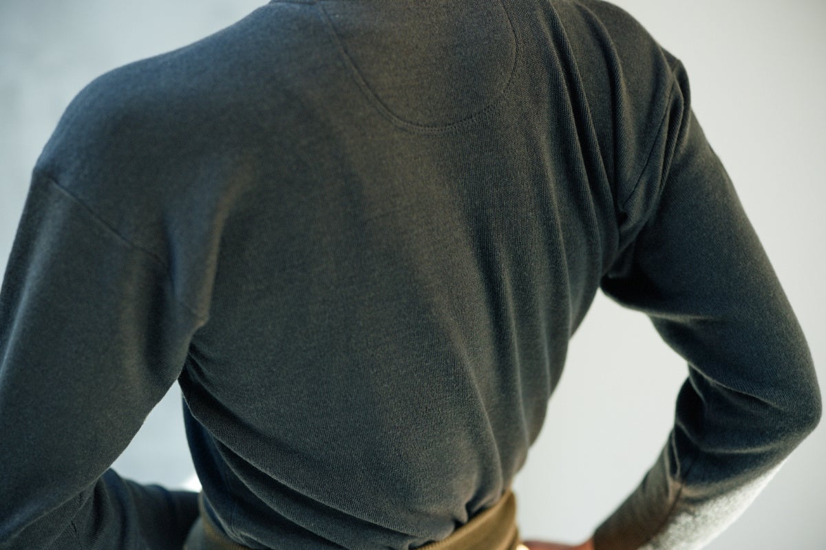 前ボタン開きの長袖のインナーです。腰を冷やさないように着丈が少し長めの設計です。主張しすぎないシンプルなデザインで、合わせる服を選ばずに日々のインナー使いとして活躍してくれます。