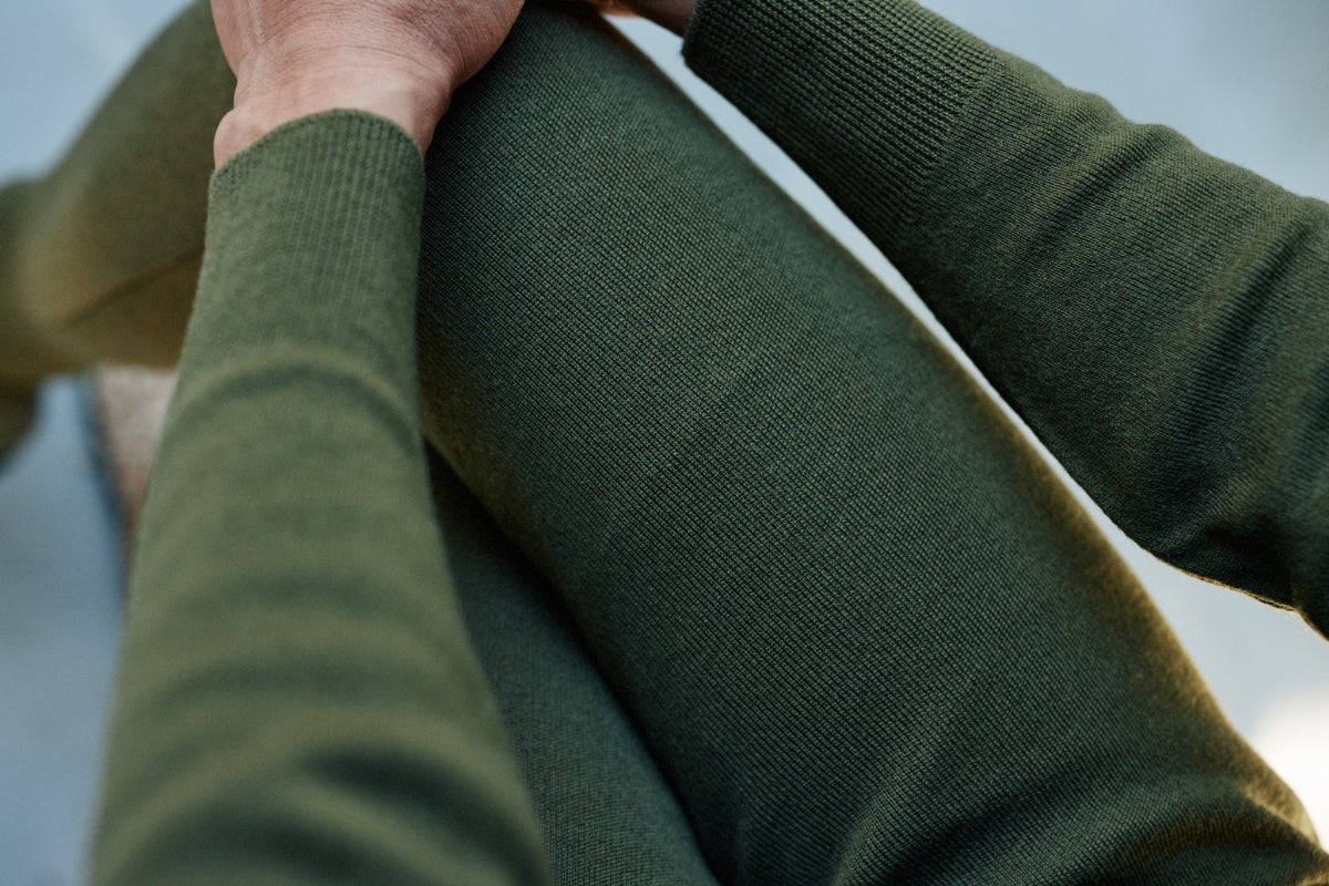 一本の糸が次々とループを繋ぐようにして編まれていくニットは、伸縮性が最大の魅力です。立ったり座ったり、歩いたり寝転んだりと、日常生活でいろいろな姿勢をとる身体にぴったり寄り添います。