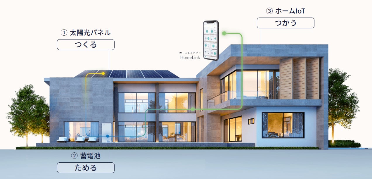 ホームプロシューマは、家庭のエネルギーをつくる(創エネ)ためる(蓄エネ)つかう(省エネ)を、ホームIoTでスマートに管理する次世代の暮らしです。ホームIoTとハイブリッド蓄電池で太陽光発電を効率的に活用し、スマホでいろいろな家電や設備を一元管理することで賢く省エネできます。