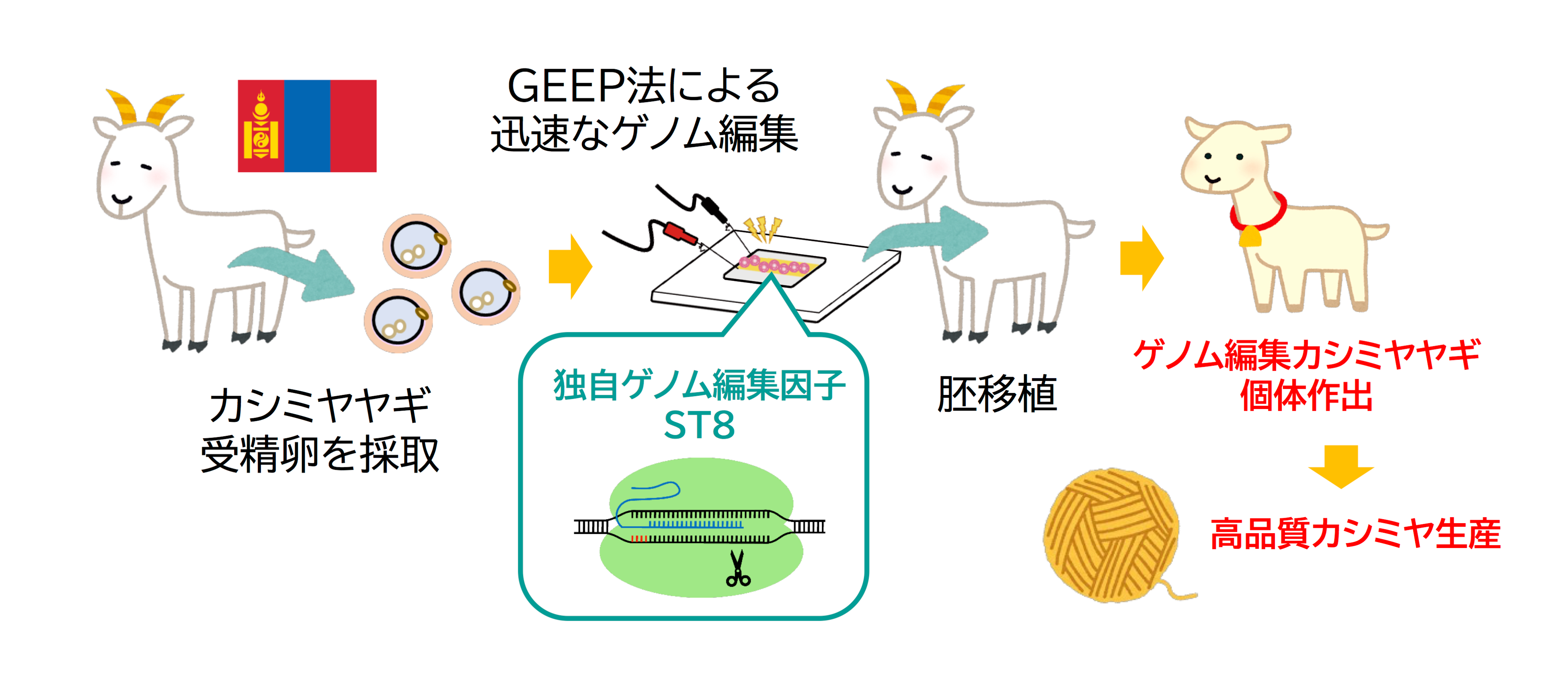 セツロテックは、モンゴル関係官庁からの実験承認とサポートを得て、現地研究機関であるモンゴル生命科学大学および国立動物ジーンバンクセンターと共同研究を行い、カシミヤヤギのゲノム編集を行います。その成果として、世界最高品質のカシミヤ繊維を生産するヤギ系統を確立することを目標とします。将来的には、環境に配慮したカシミヤ繊維生産によるモンゴルの持続的な畜産業の確立に貢献します。