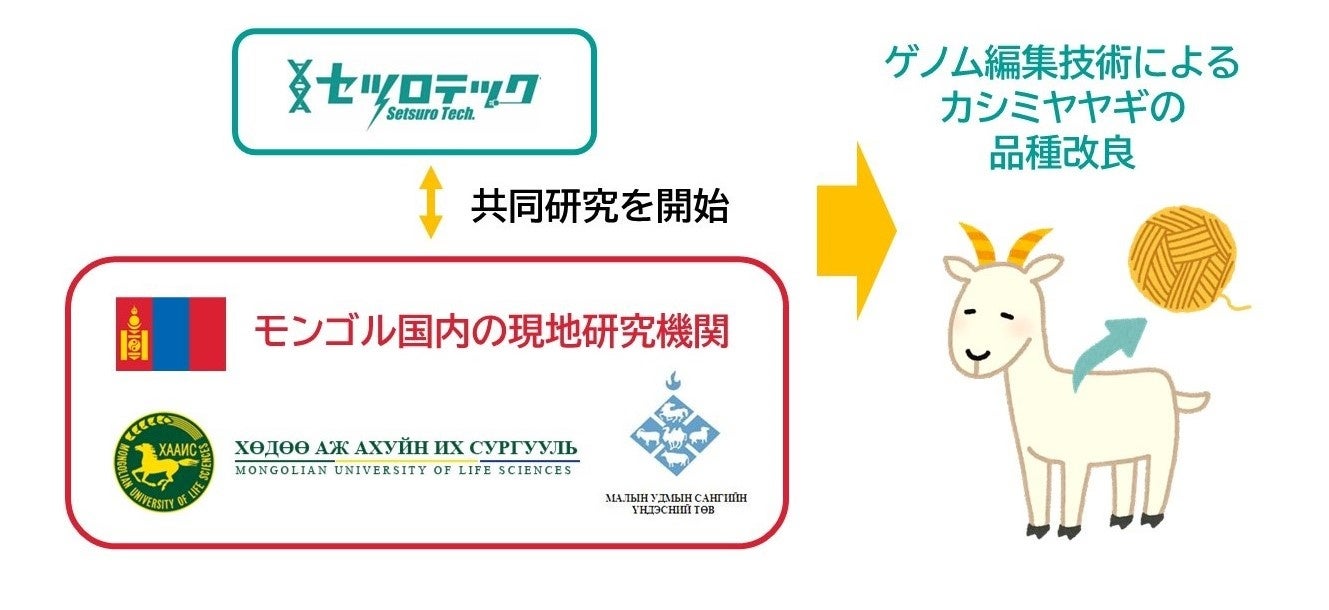 ゲノム編集受託サービスを提供する株式会社セツロテック(本社:徳島県徳島市、代表取締役:竹澤慎一郎、以下「セツロテック」)は、モンゴル国(以下「モンゴル」)において、モンゴル生命科学大学獣医学部および動物科学バイオ技術学部、ならびに国立動物ジーンバンクセンターと共同研究を行い、ゲノム編集技術を用いたカシミヤヤギの品種改良を目指します。セツロテックが保有するゲノム編集技術を導入することで、世界第2位のカシミヤ繊維の供給国であるモンゴルのカシミヤ繊維の品質を世界最高質に高め、持続的なカシミヤ産業に貢献することを目指します。現在、セツロテックでは、この研究成果を活用して事業化を目指す、パートナー企業を広く募集しています。