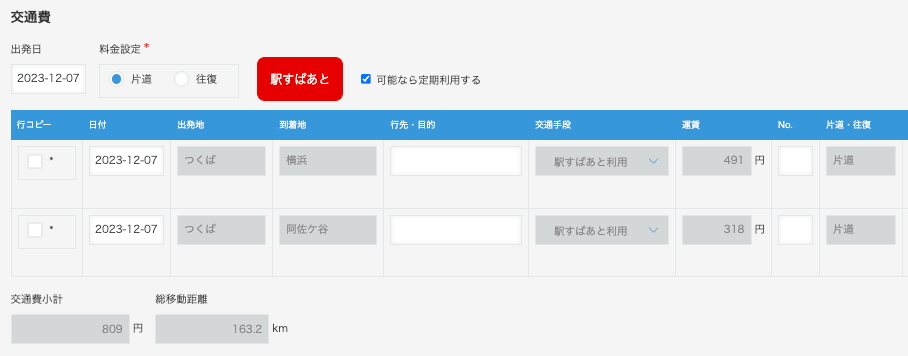 出発地と到着地を入力するだけで、駅すぱあとから最適な経路と金額を自動反映。電車代やバス代などを正確に計算できます。