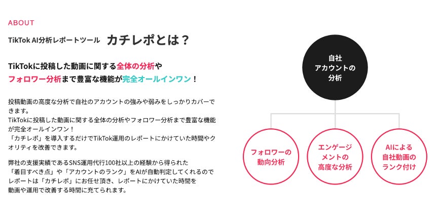 当社では、TikTokが国内で広がり始めた初期段階から注目し、効果検証に特化した分析レポートサービス「カチレポ」を展開してきました。これまでのプロモーション支援で蓄積した知見をTikTok Shopの導入支援にも活かし、データに基づいたPDCA運用と、プラットフォーム特性を踏まえたクリエイティブ制作を組み合わせた、実効性の高いサポートを提供しています。