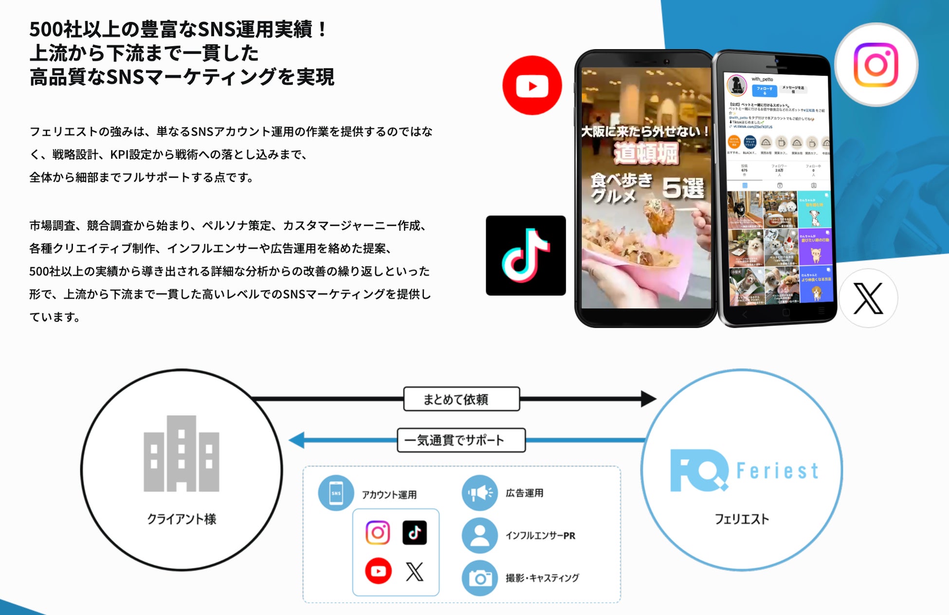 フェリエストは、「企画戦略 × クリエイティブ制作 × 配信・広告運用 × 効果検証」を一体化させた統合的な支援体制により、SNSを“情報発信の場”から“売れる場”へと進化させ、企業の成果に直結する購買導線の構築を支援してまいります。
