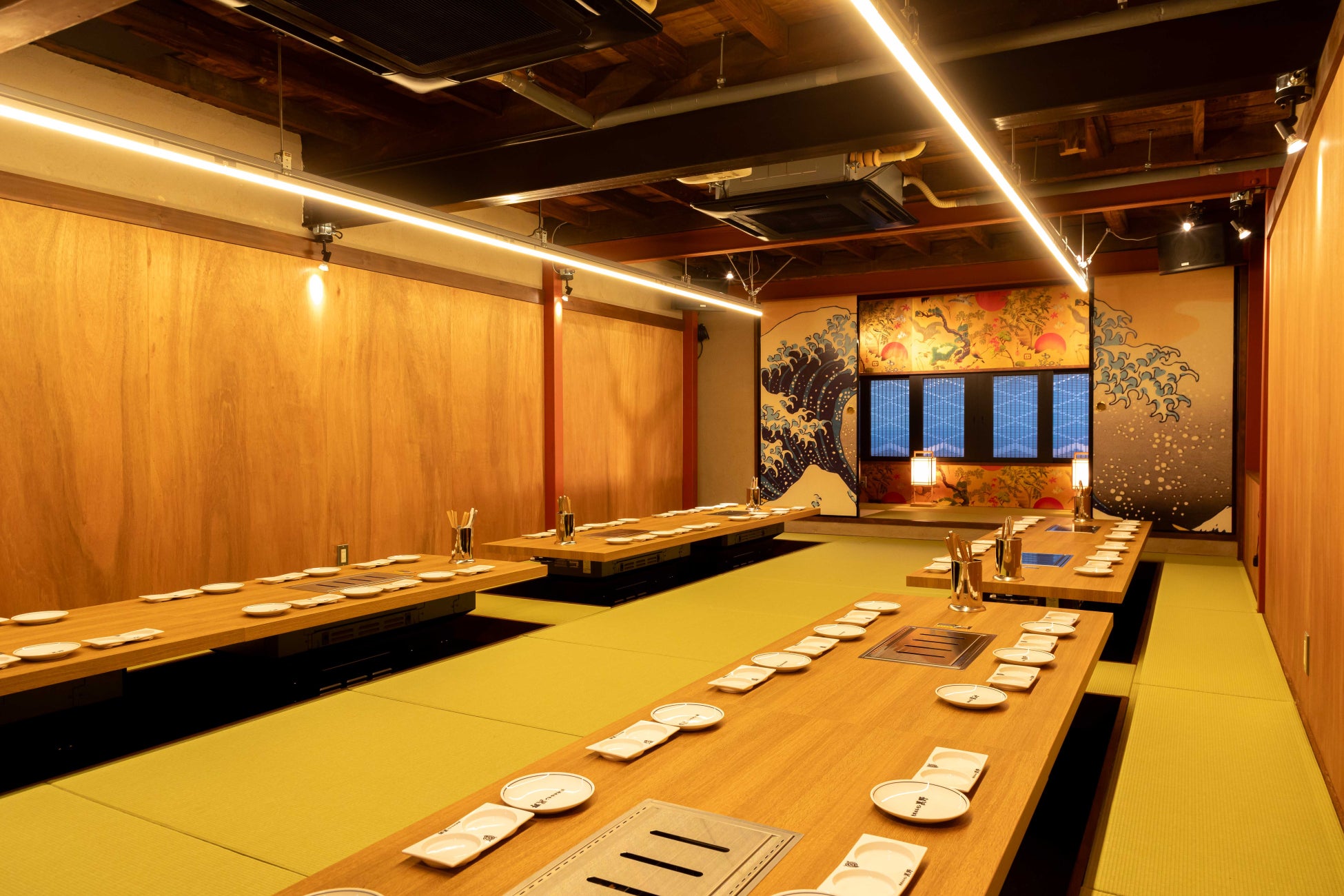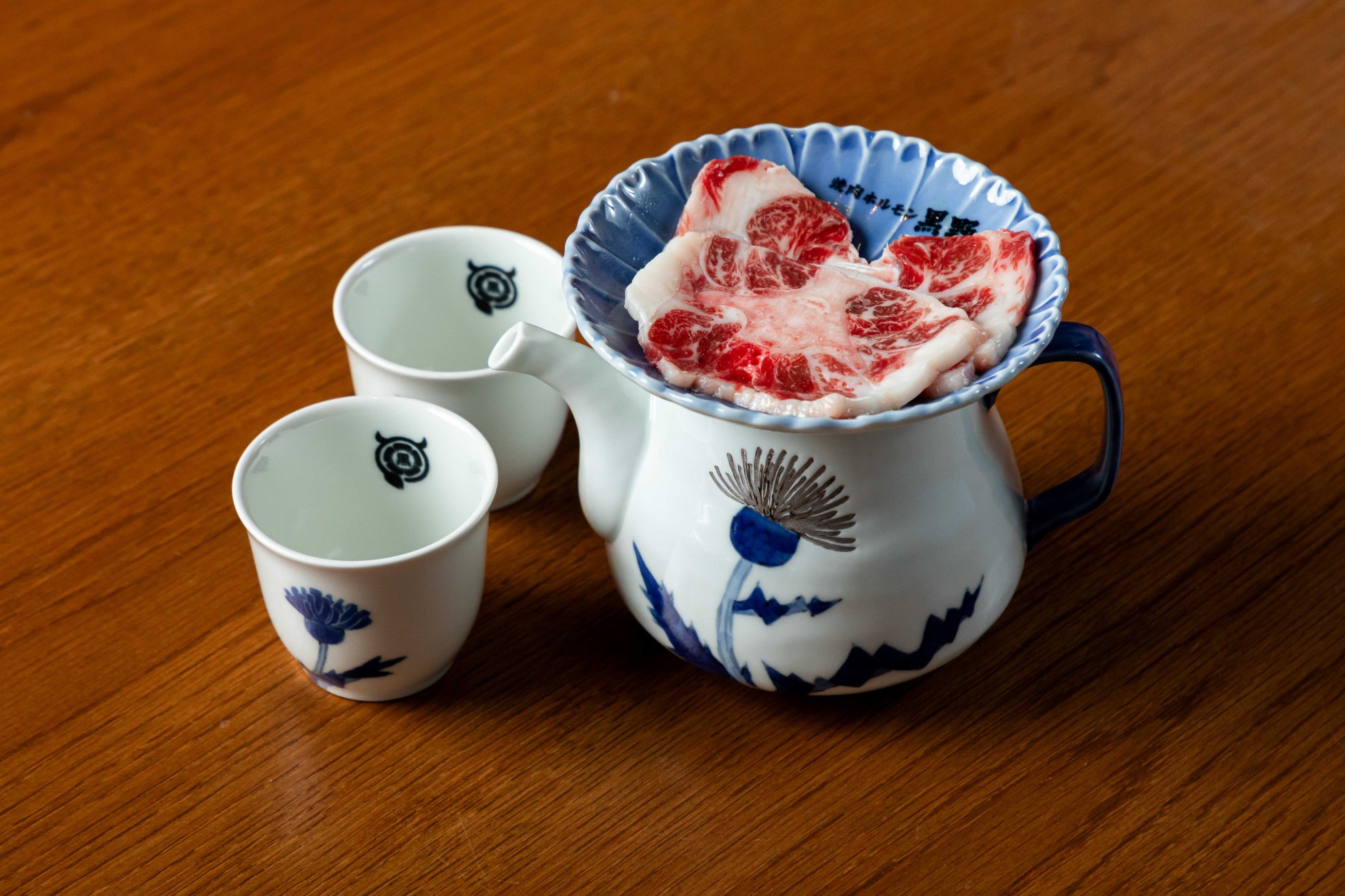 焼肉ホルモン 黒野 の内外装は、古い木造倉庫をそのまま活かした情緒ある空間。提供時のお皿には有田焼を使用し、日本文化を感じていただけます。