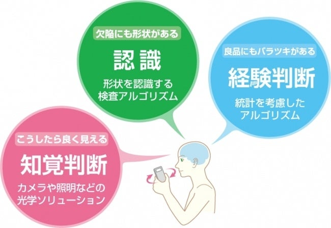 生産現場で実施されている目視の機能とその利点を分析し、「見る」という一つの行為を「経験判断」・「認識」・「知覚判断」に分類し、それを画像処理検査装置で実現しています。
