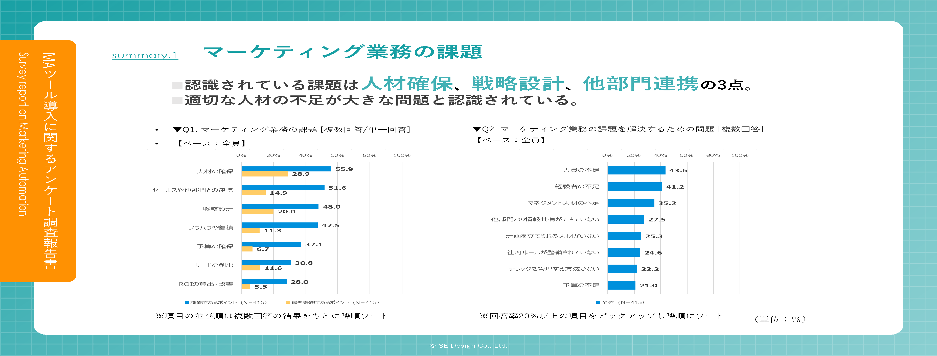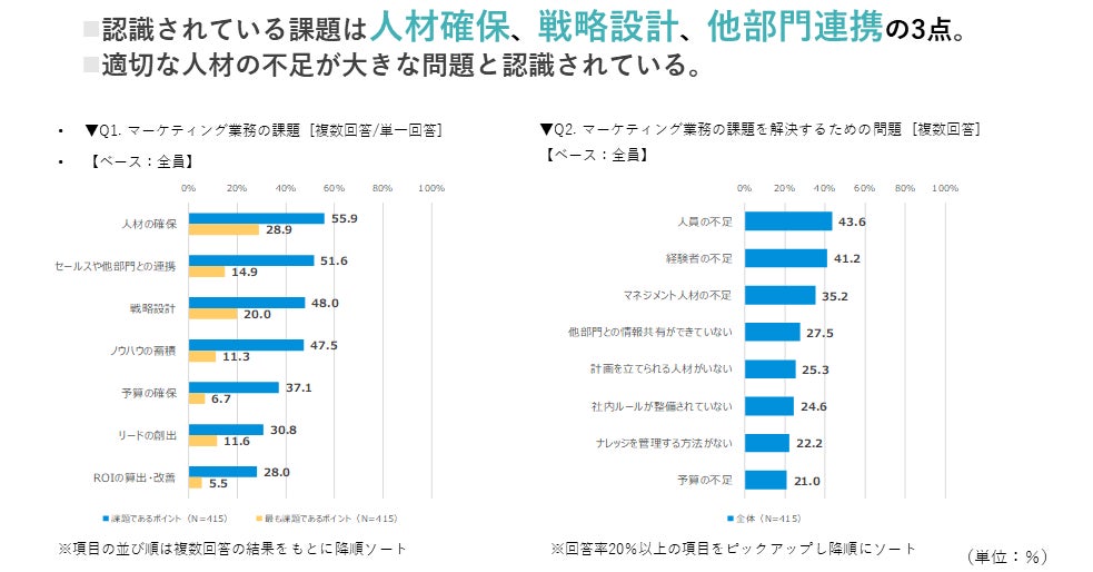 また「Q2.マーケティング業務における課題を解決するためにどのような問題がありますか。 あてはまるものを全てお知らせください(複数回答)」(n=415)と質問したところ、上位3項目は「人員の不足」「経験者の不足」「マネジメント人材の不足」となっており、人材不足が最大の課題であると考えてよさそうです。