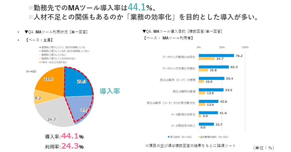 - 勤務先でのMAツール導入率は44.1%。「業務の効率化」を目的とした導入が多い