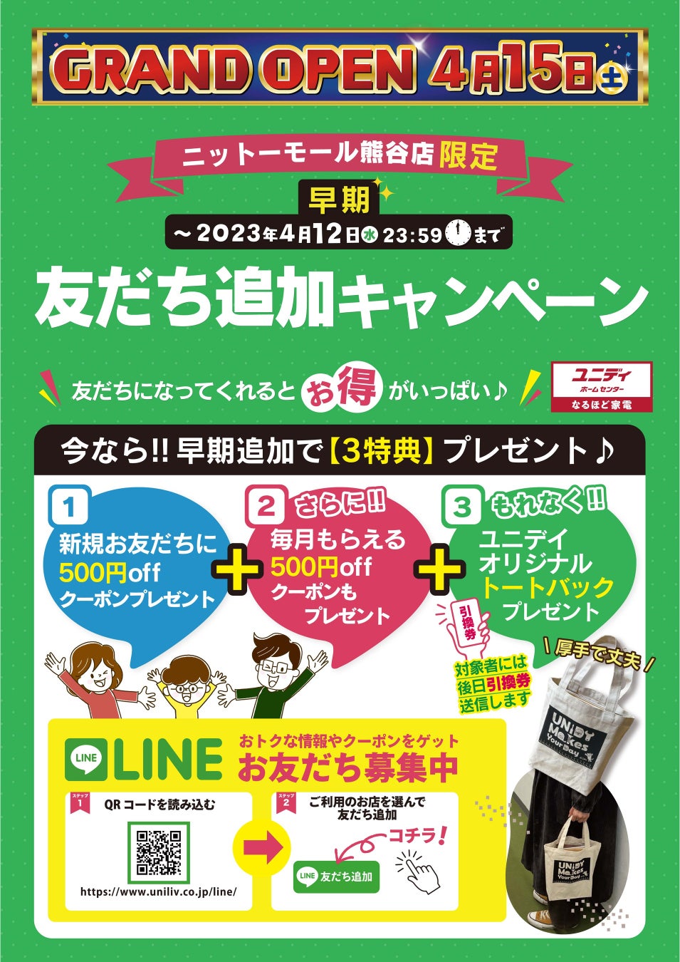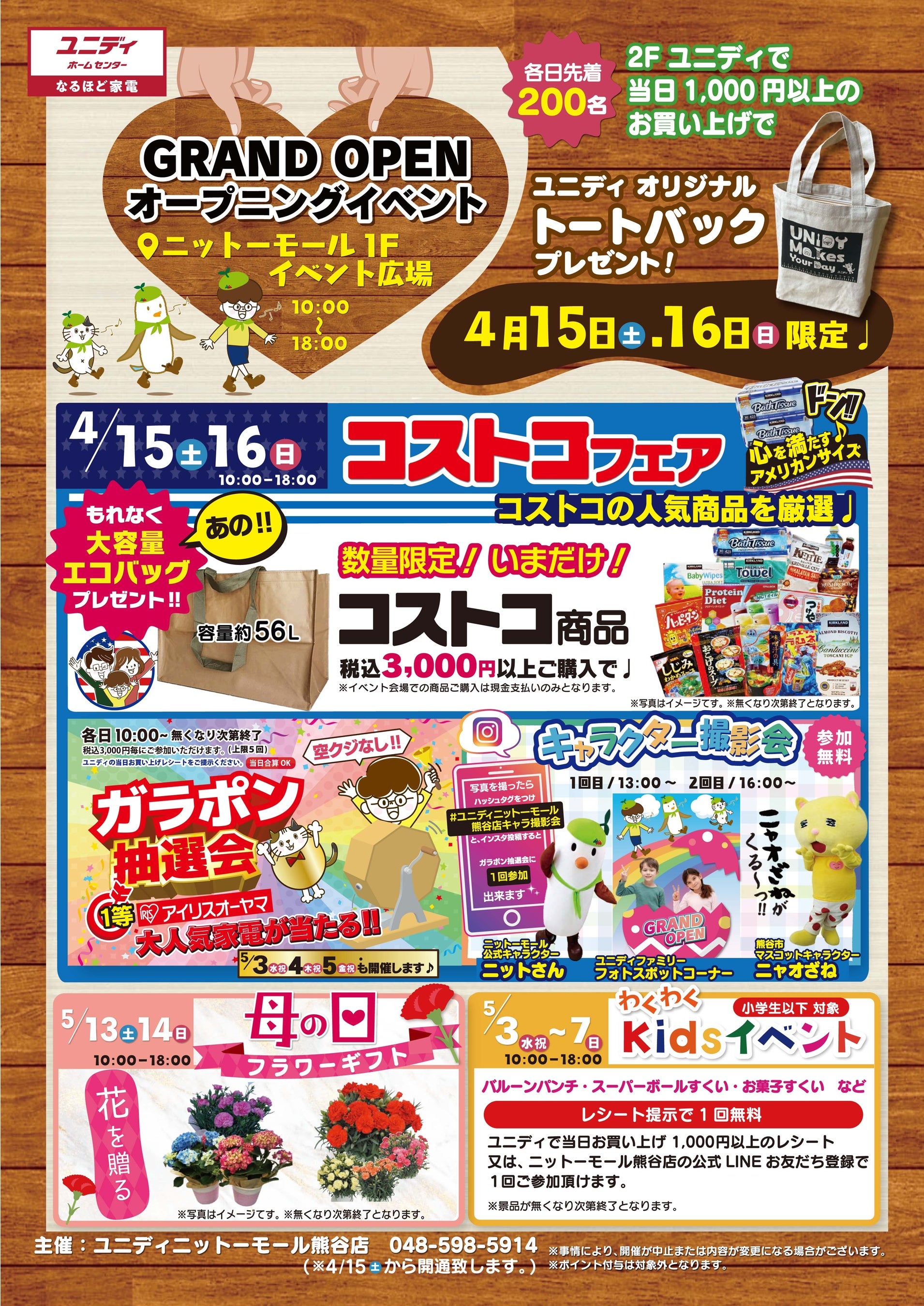 4月15日(土)、16日(日)の2日間は、ユニディ ニットーモール熊谷店で当日1,000円以上のお買い上げで各日先着200名様に「ユニディオリジナルトートバッグ」をプレゼントいたします。