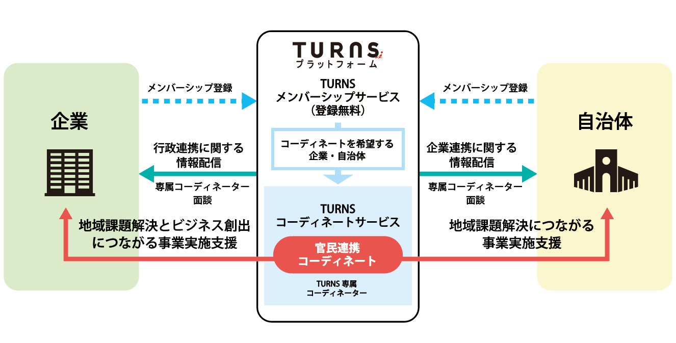 4月に新たにスタートした「TURNSプラットフォーム」は、自社のスキルや技術力を活かして地域に貢献したい民間企業と、それらの企業の力を活用したい自治体をつなぐ、マッチングサービスとなる。