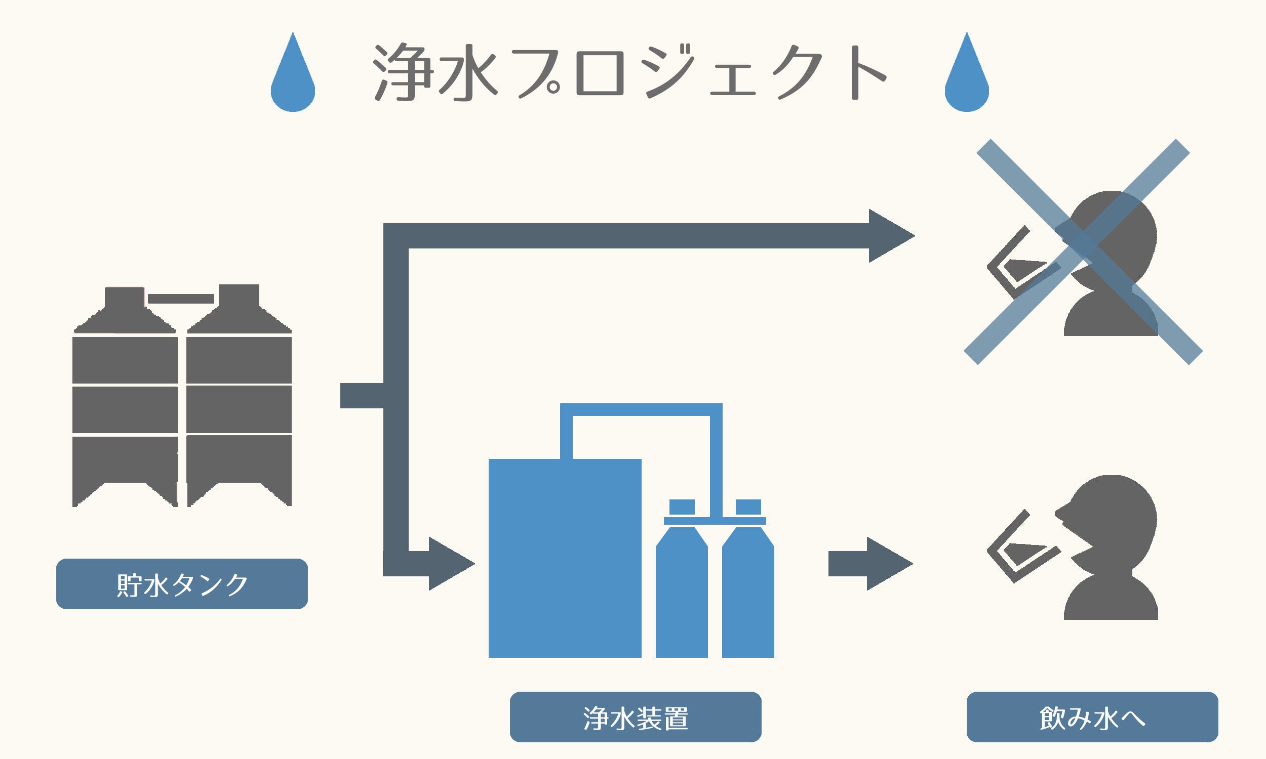 2030年までに、誰もが安全な水の普遍的なアクセスを達成し、淡水の自得可能な供給を確保し水不足に対処するとともに、水不足に悩む人々の数を大幅に減少させることついても検討され、その目標は17の目標の6番目「安全な水とトイレを世界中に」となっています。発展途上国の特に地方の学校には水道設備やトイレが設置されていないことも多く、この目標は、そこで勉強する生徒や先生方の健康にも目を向けています。ミャンマーで開始する「浄水プロジェクト」は、学校に設置されている給水タンクを修復・また溜めている水を飲料可能なレベルまで引き上げることで、生徒や教師が安心して学校内で水を使用できるようにします。