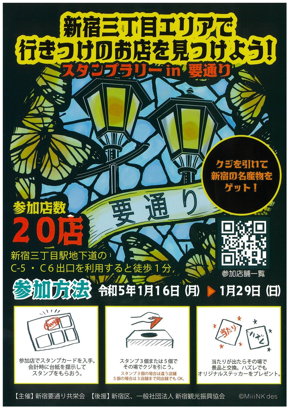 新宿要通り共栄会(理事長:矢向剛)は、1月16日(月)~29日(日)の約2週間にわたり、「『新宿三丁目エリアで行きつけのお店を見つけよう!スタンプラリー』in要通り」を開催します。