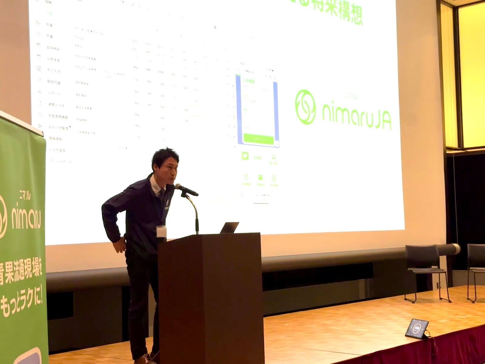 弊社代表取締役上村聖季より、デジタル変革が進む現代におけるデータ活用の重要性と、nimaruがどのようにその戦略を支援できるかについて講演いたしました。また、nimaruの今後の新機能やサービス拡張計画を発表し、来年度以降は花卉の取り組み、タブレットを利用した自動集計・QRシールを活用した現場でのデジタル化、選果場でのnimaru活用、そして「購買」分野の機能リリースなどを予定していることをご説明しました。