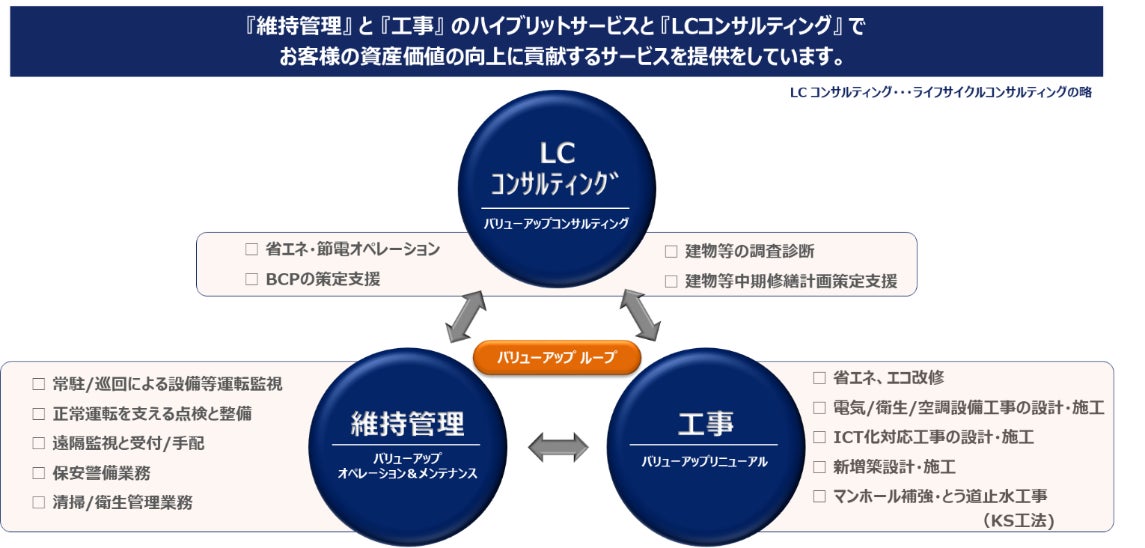・統括ビルマネジメント業務(維持管理を統括する業務で、具体的には、法令チェックや維持管理費の適正化・節減(省エネルギー)提案、図面管理、劣化診断、中長期計画作成支援など)