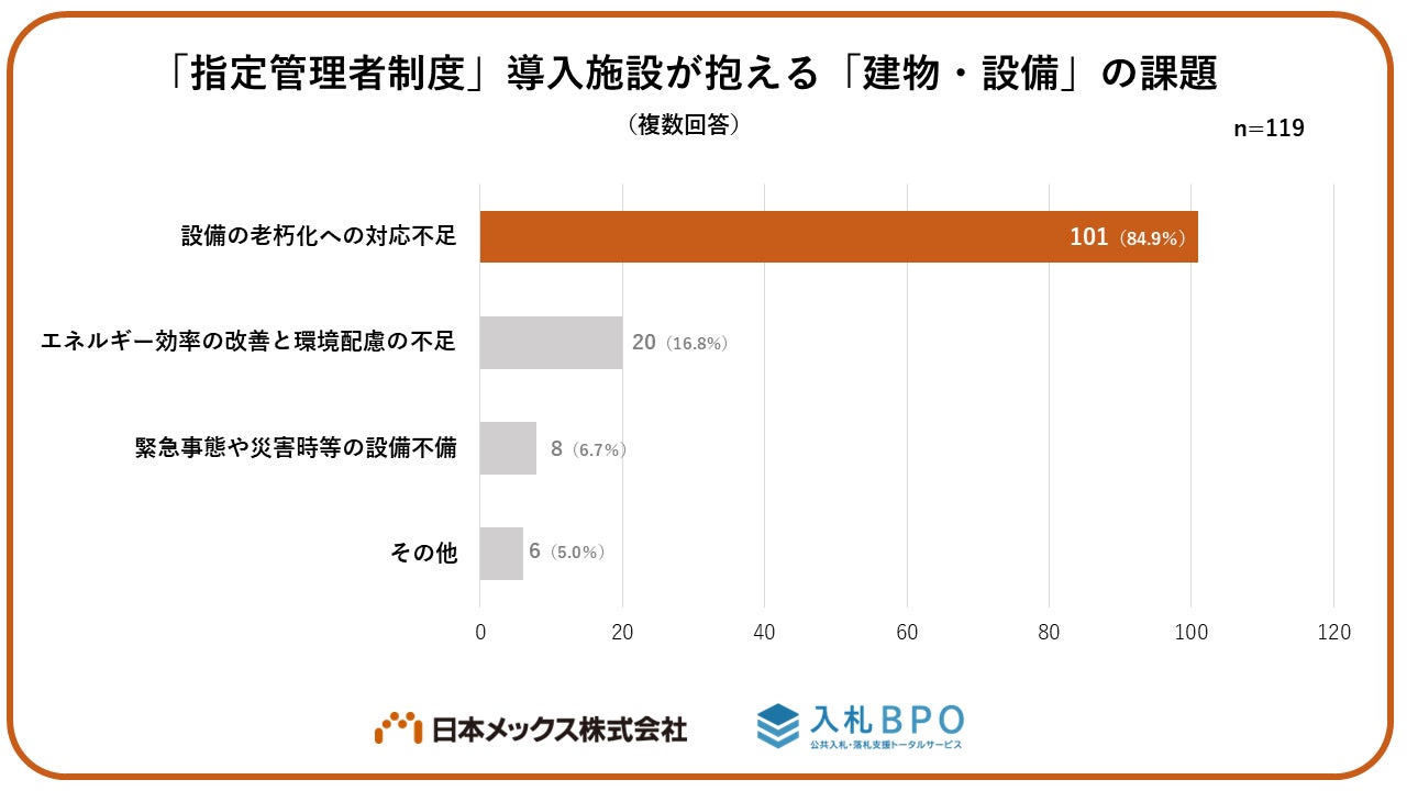 「指定管理者制度」導入施設が抱える「建物・設備」における課題に関する質問では、8割を超える(84.9%)自治体が「設備の老朽化への対応不足」と回答しました。次いで「エネルギー効率の改善と環境配慮の不足」(16.8%)という結果になりました。