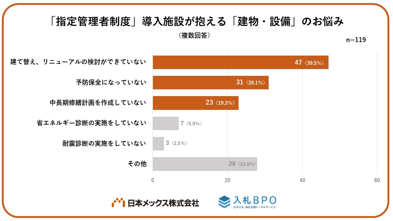 「指定管理者制度」導入施設が抱える「建物・設備」のお悩みについて質問したところ、「建て替えリニューアルの検討ができていない」と回答した自治体が約4割(39.5%)と最も多い結果となりました。<結果2>では「建て替えやリニューアル」の検討を進めている自治体は約2割(20.2%)だったことから、「建て替えやリニューアルの必要性は感じているものの、具体的に検討ができていない」というお悩みを抱えていることが伺えます。