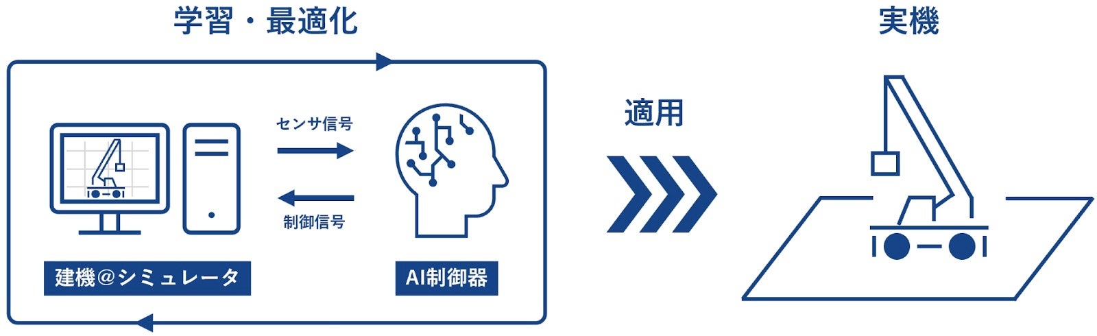 そこでDeepXとタダノは、強化学習を応用したアプローチを用いて制御アルゴリズムを開発しました。このアルゴリズムの特徴は、制御対象のシステムの挙動を一意に同定して設計するのではなく、シミュレーションデータおよび実機の設計値に基づいて制御アルゴリズムの学習・最適化をすることで、荷揺れを抑制しながら吊り荷を安全、かつ正確に任意の位置に移動できることです。