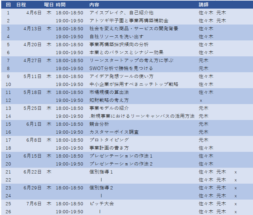 「アトツギゼミ」のプログラムは、前半で事業再構築補助金に申請に必要なビジネススキル全26講座で獲得し、プログラム終了後は参加者同士がつながるコミュニティに参加することができます。(月額3,300円)コミュニティでは、定期的な勉強会をはじめ、異業種交流によるデザインシンキング、海外トレンドリポート、ChatGPT等AI技術の最新トレンドの共有、最新の補助金情報他、アトツギビジネスに有用な情報を得ていただけるよう、切磋琢磨できる交流の場を設定します。不定期ですが、オフラインの交流会、または現場視察なども取り入れる予定です。高校生はビジコン入賞や総合型選抜入試合格、大学生はビジコンやインターンに必要なスキルを学びます。