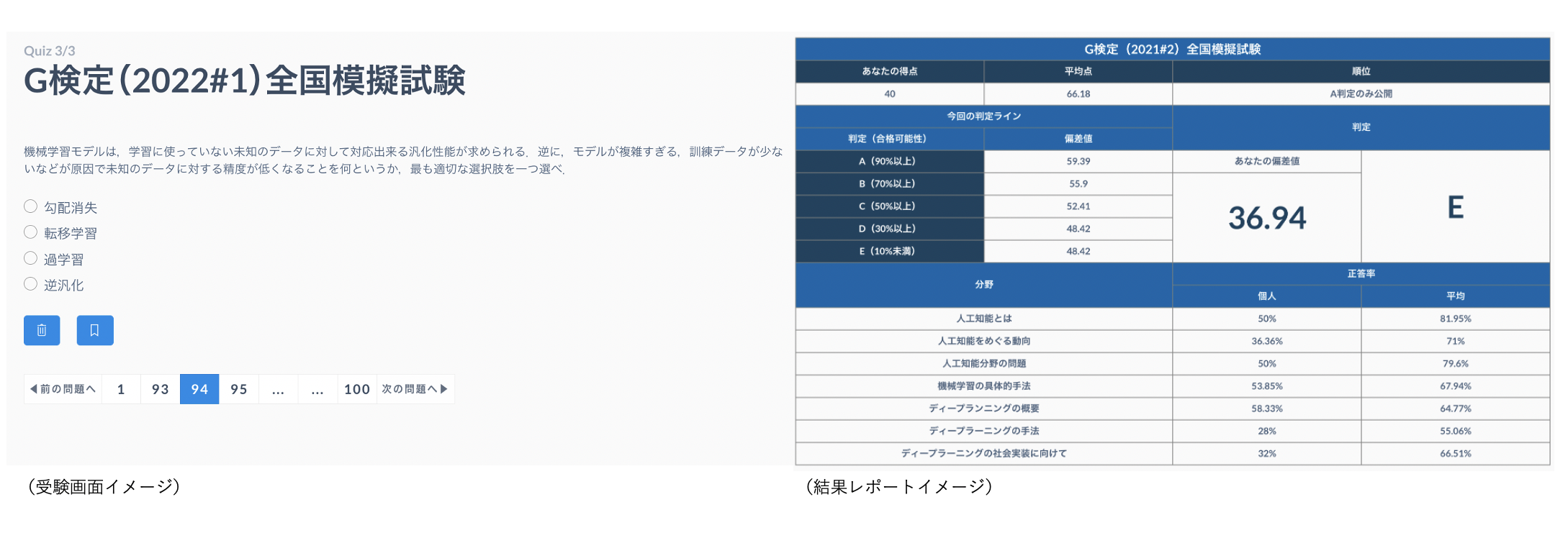 今回zero to oneでは、これまでの知見や自社開発の教育システムを活用し、「G検定(2022#2)」向けの全国模擬試験を開催いたします。受験を希望される方は、オンラインでどこからでも、無償で受験をいただいた上で、受験後数日以内に個別に発行される結果レポートにて、点数、偏差値、全国順位や、分野ごとの正答率などをご確認いただくことが可能です。
