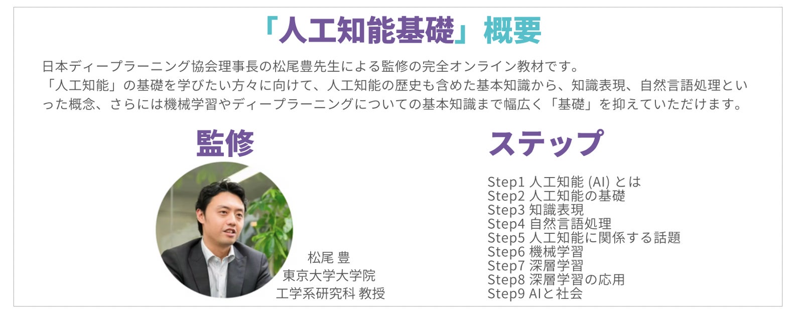 zero to oneは、完全オンライン教材である「人工知能基礎」(監修:東京大学松尾豊教授、以下概要)、「G検定実践トレーニング」等を通して、これまでにのべ100社、累計3,000人以上の方々に「G検定」向け、もしくは「G検定」の出題範囲に応じた教育コンテンツの提供を行なってまいりました。また、2021年2月より開始した「行政職員向け無償提供プログラム」を通して、既に100以上の官公庁、地方自治体職員の方々に人工知能の基礎教材を受講をいただいています。
